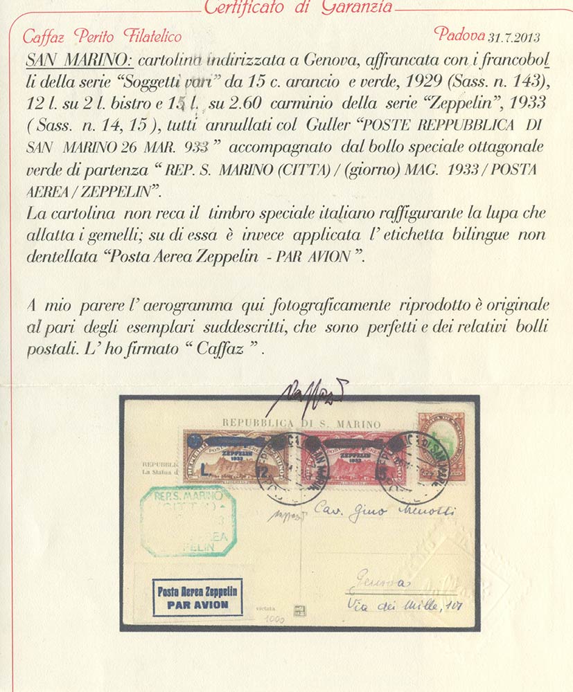 1933, Cartolina viaggiata per via aerea tramite volo Zeppelin, affrancata tramite P.A. N.14 e N.15 + 15c. Arancio e verde N.143. Dettagliato certificato Caffaz.