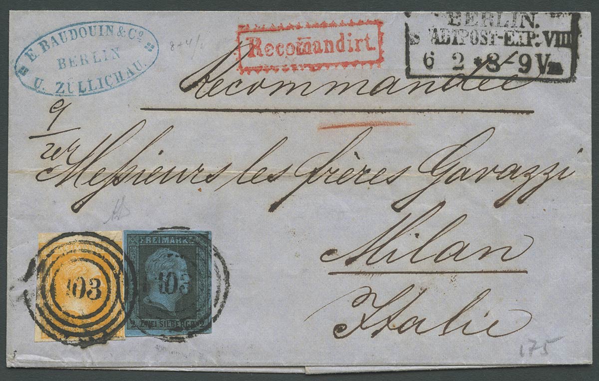 1850, Prussia. Lettera raccomandata da Berlino per Milano affrancata tramite un 2s. Neri su Azzurro N.4 e un 3s. Arancio N.8. (A+)