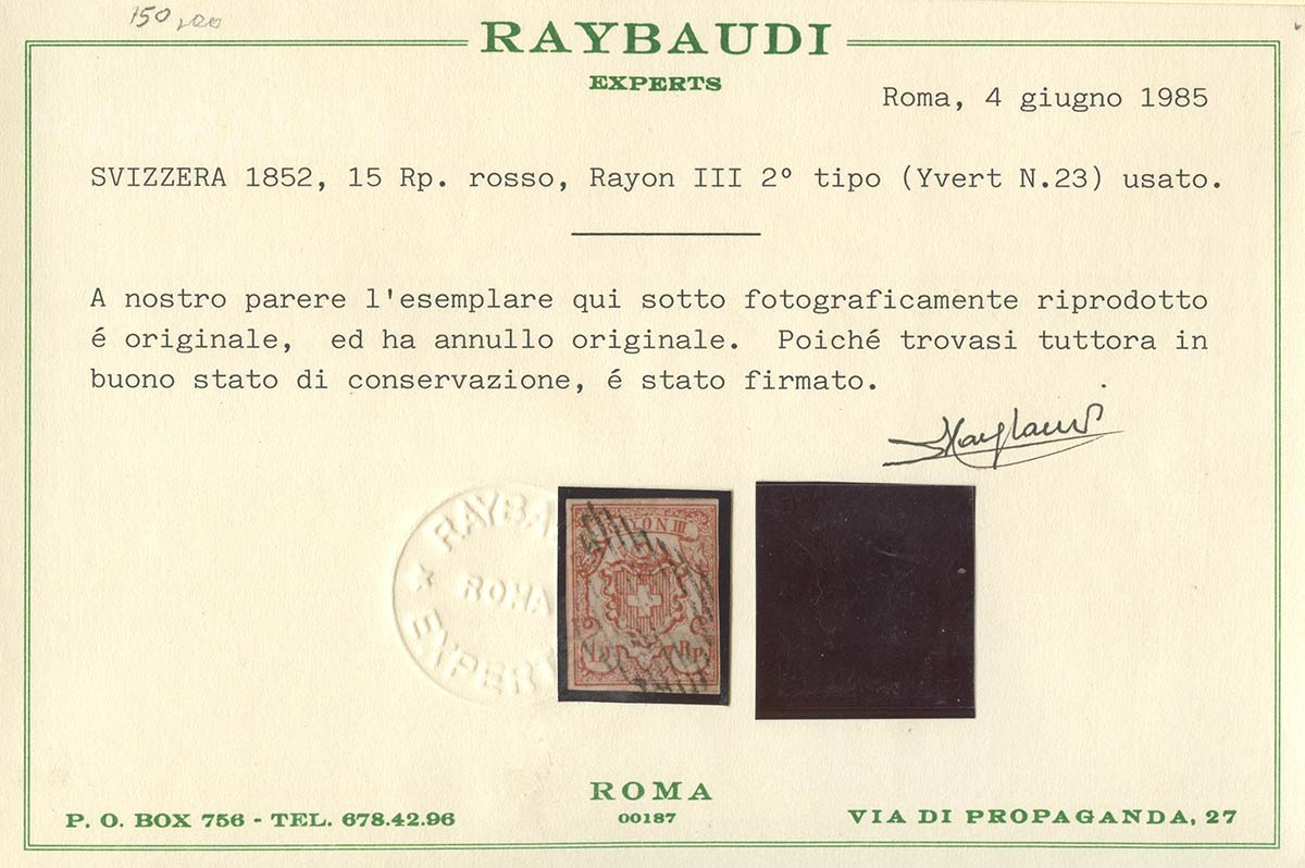 Precedente Lotto 660 Successivo Bertolami Fine Art - Piazza Lovatelli 1, 00186 Roma Web Auction 114 - Filatelia Sessione Unica martedì 5 aprile 2022 ore 12:00 (UTC +01:00) 1852, 15r. N.23 usato. Difettoso. Cert.Raybaudi. 1852, 15r. N.23 usato. Difettoso. Cert.Raybaudi.