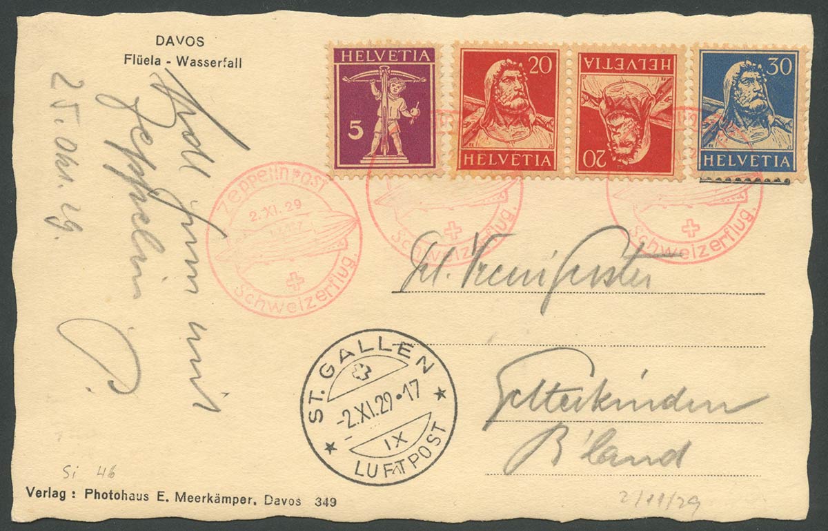 Zeppelin, Cartolina affrancata tramite N.198, 205,203 (in coppia tete-beche) viaggiata con volo Zeppelin da St. Gallen 2.11.1929.