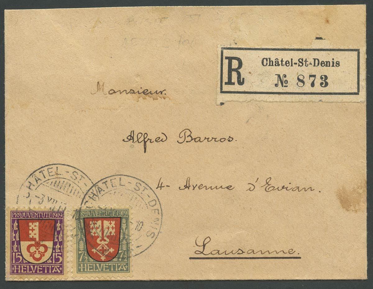 3.12.1919, Lettera raccomandata da Chastel St.Denis per Losanna affrancata con N.173 e N.175