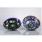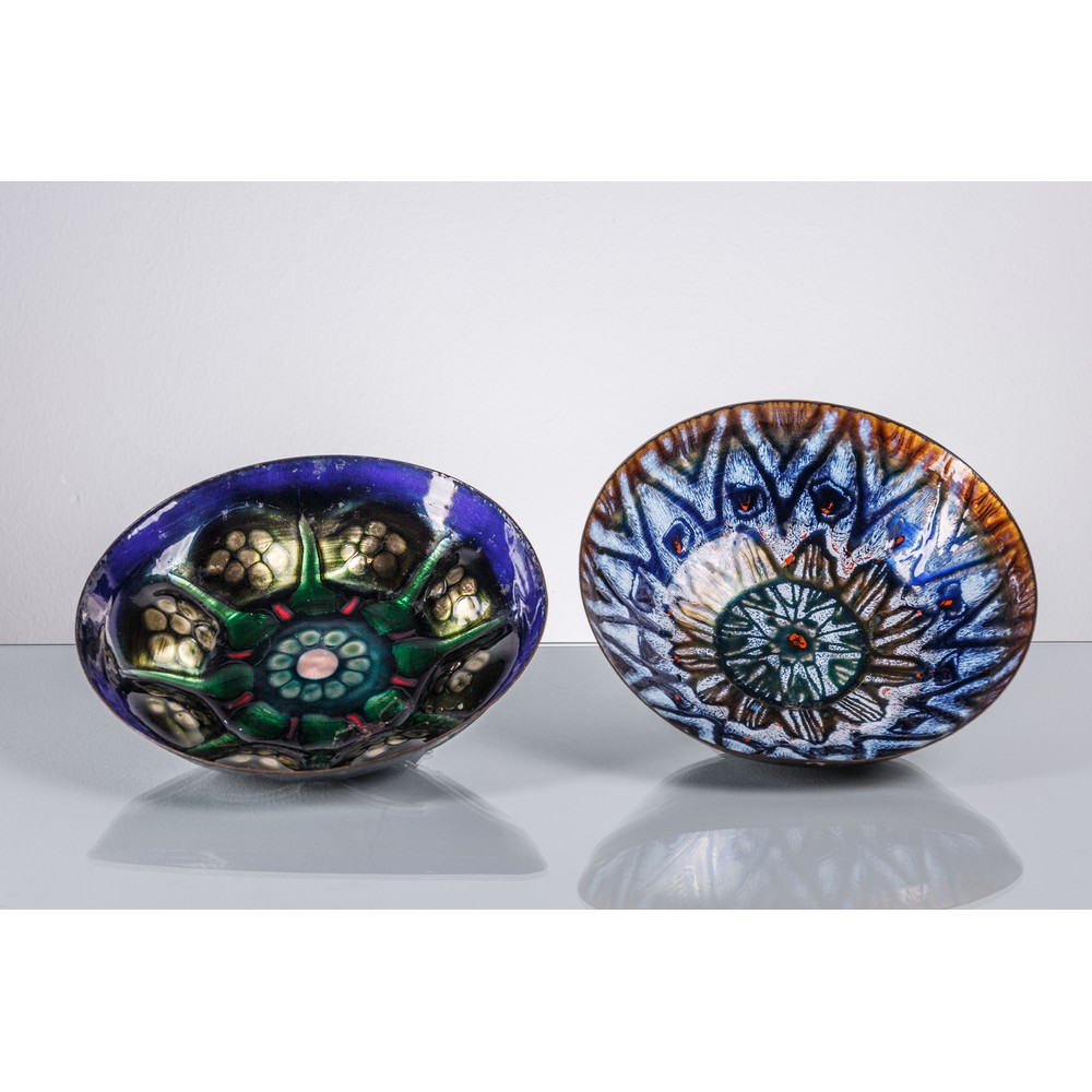 Due grandi coppe semisferiche in rame sbalzato con smalti a fuoco, decoro geometrico policromo, una reca etichetta Romolo Verzolini.