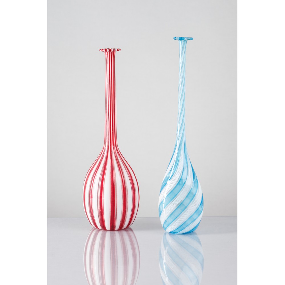 Due bottiglie in vetro lavorato con filigrane a canne colorate rosse e azzurro, corpo ovale con lungo collo, bordo estroflesso.