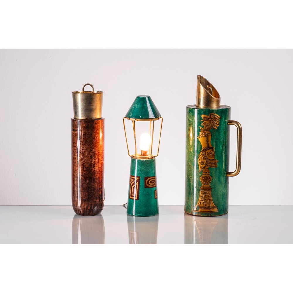 Due thermos e una piccola lampada da tavolo in legno e pergamena verde con decori oro, finiture in ottone, (presente un'etichetta nel thermos-caraffa grande).