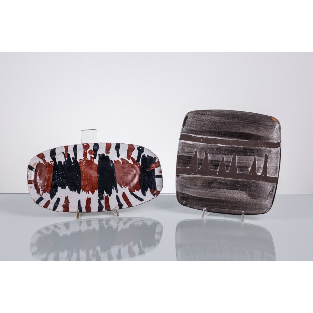 Due svuotatasche in ceramica smaltata, uno ovale con decori astratti marrone e nero su fondo bianco a marchio CERI, l'altro quadrato con decoro astratto marrone e nero, sbeccature.