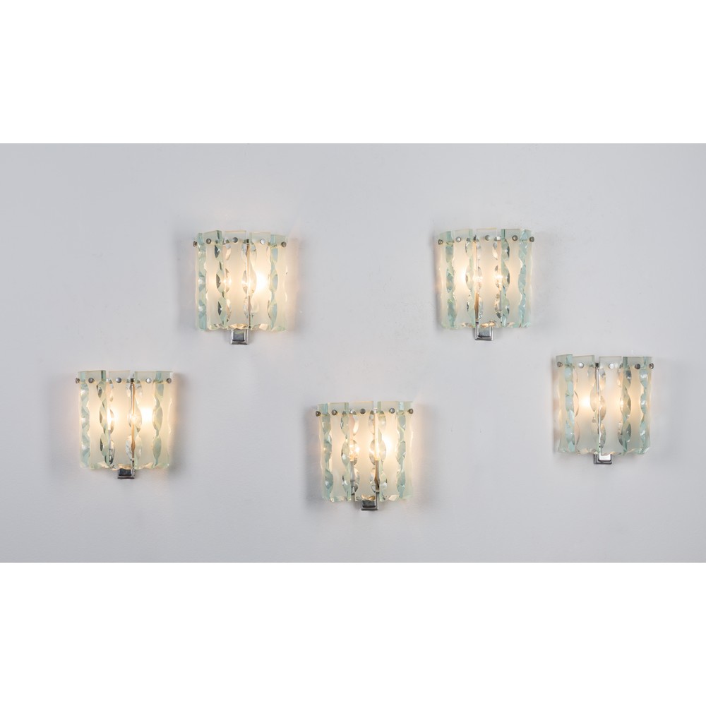 Cinque lampade da parete ad una luce, struttura in metallo cromato, corpo curvato formato da vetri scalpellati di forte spessore verde Nilo.