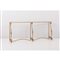 Grande consolle a tre gambe in ferro battuto dorato, piano rettangolare in vetro trasparente.