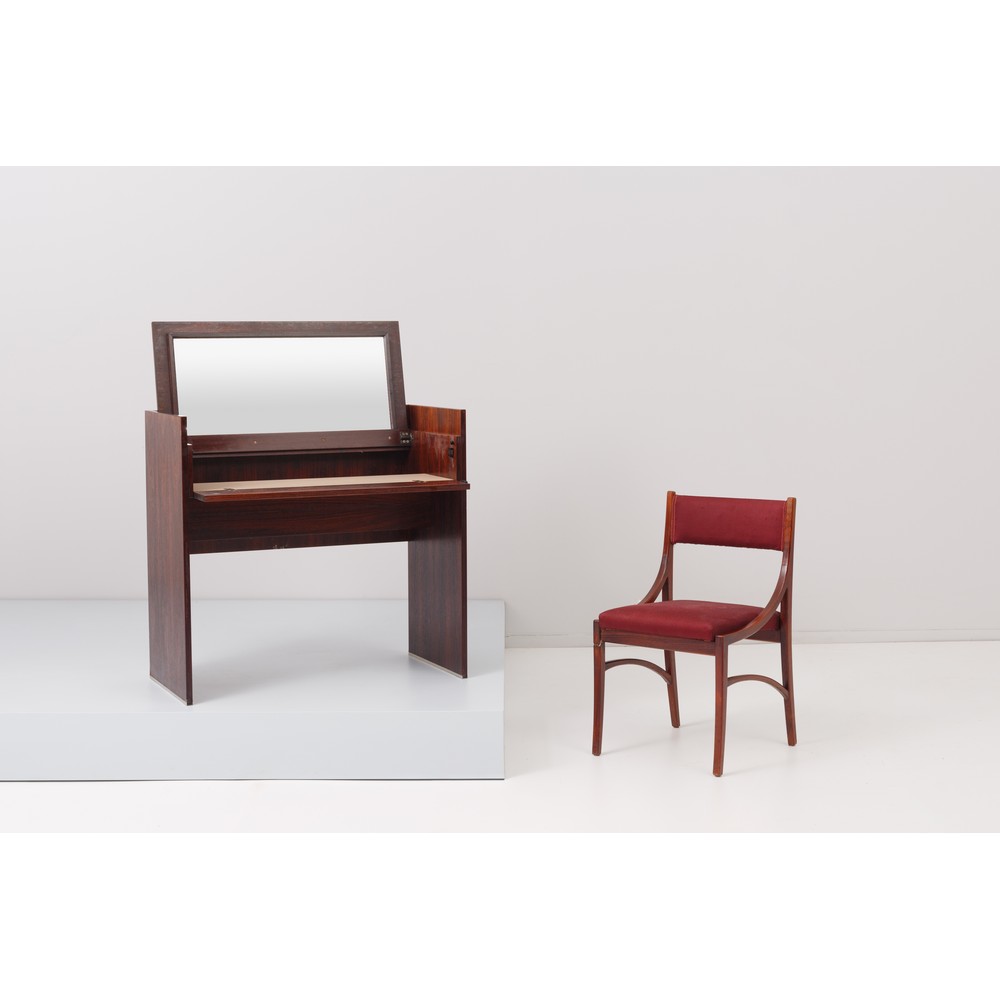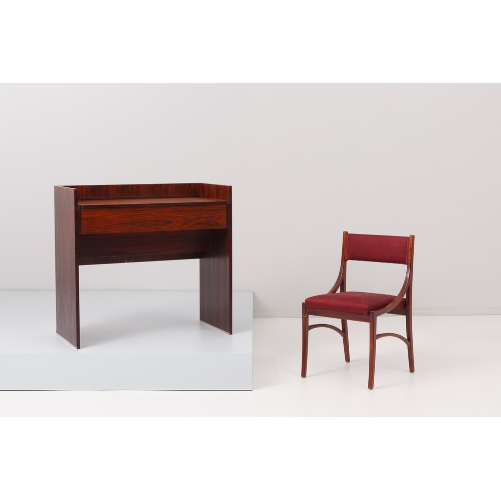 Mobile in palissandro rio con piano a ribalta a toletta, sedia in legno di palissandro con seduta rivestita con tessuto rosso.