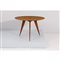 Tavolo rotondo in legno di teak, piano con bordo arrotondato, tre piedi a spillo.