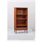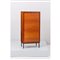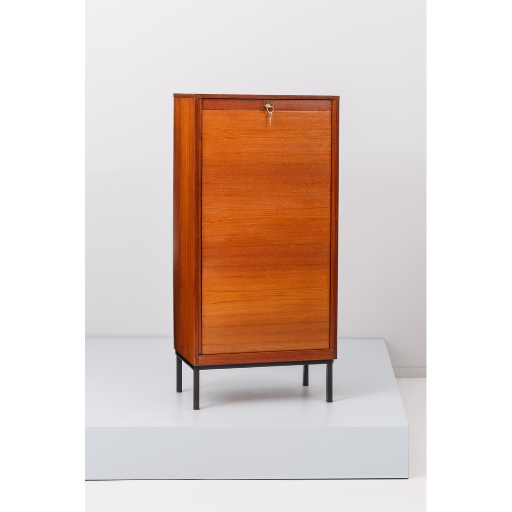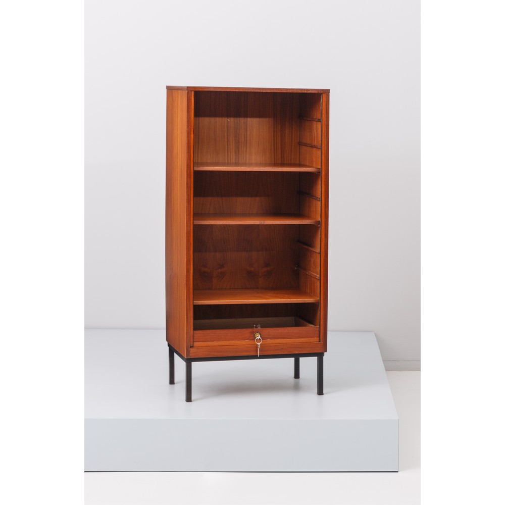 Mobile con ripiani in legno, anta a serranda, piedi in metallo laccato nero, segni di usura.
