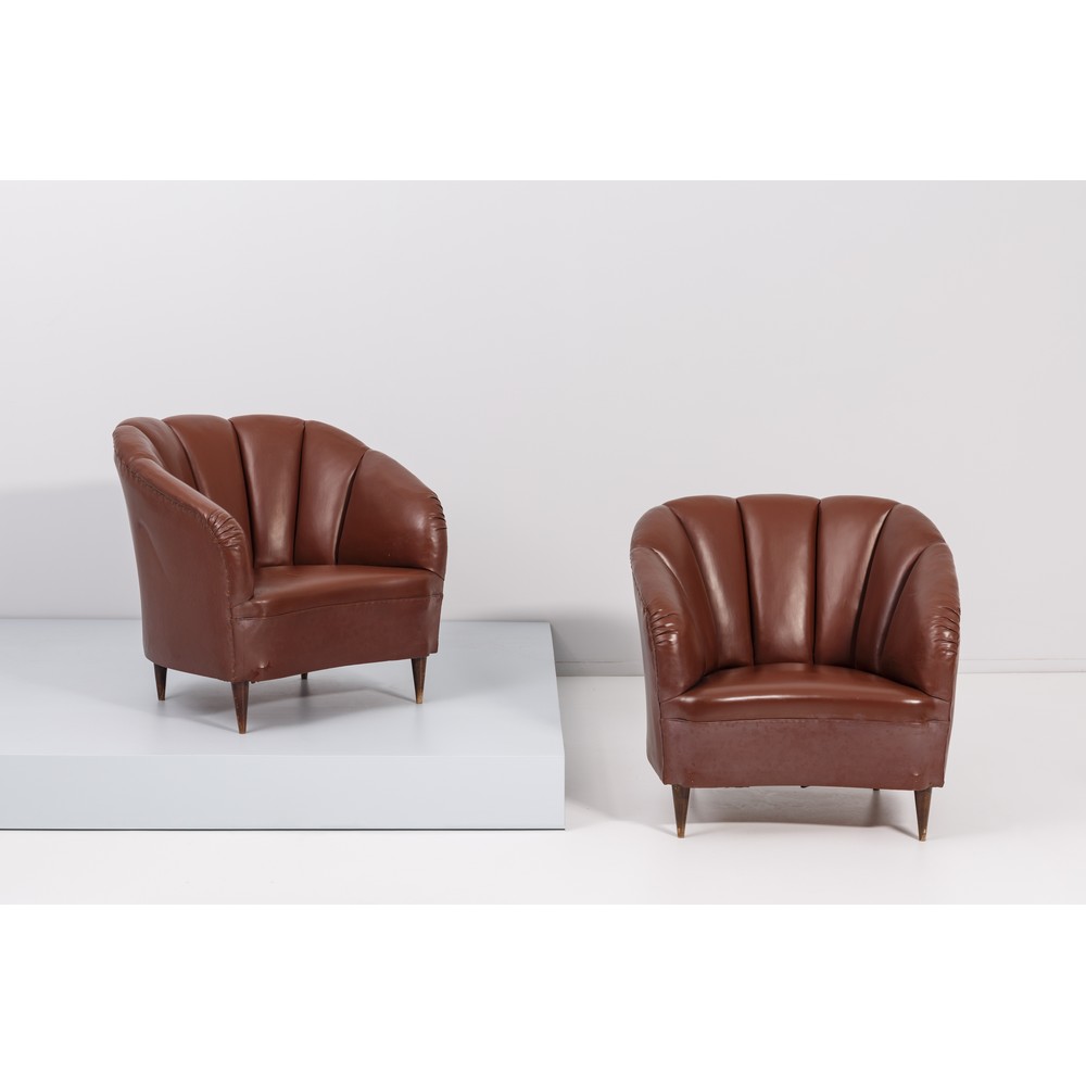 Coppia di poltrone a pozzetto struttura in legno con imbottitura e rivestimento in skai marrone, piedi a cono.