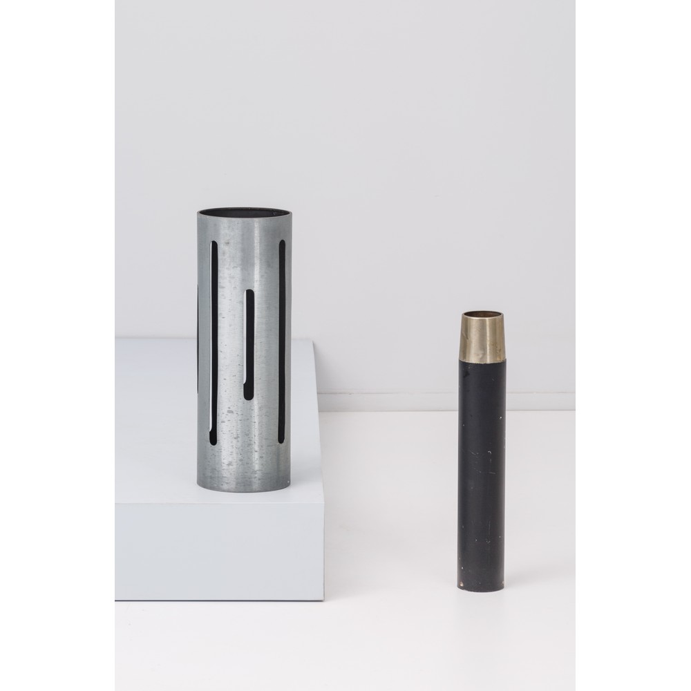 Un portaombrelli cilindrico in alluminio spazzolato ed un posacenere da terra cilindrico in metallo verniciato nero e dorato.
