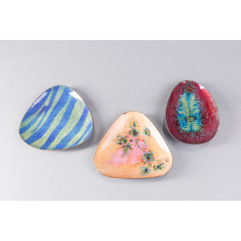 Tre posaceneri in metallo smaltato, due con corpo triangolare, uno ovale, decori policromi.
