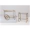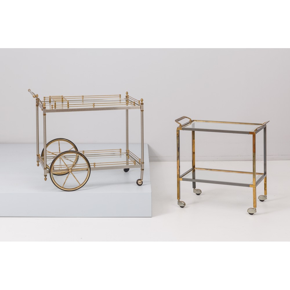 Due carrelli a doppio ripiano in ottone e vetro, uno con due grandi ruote.