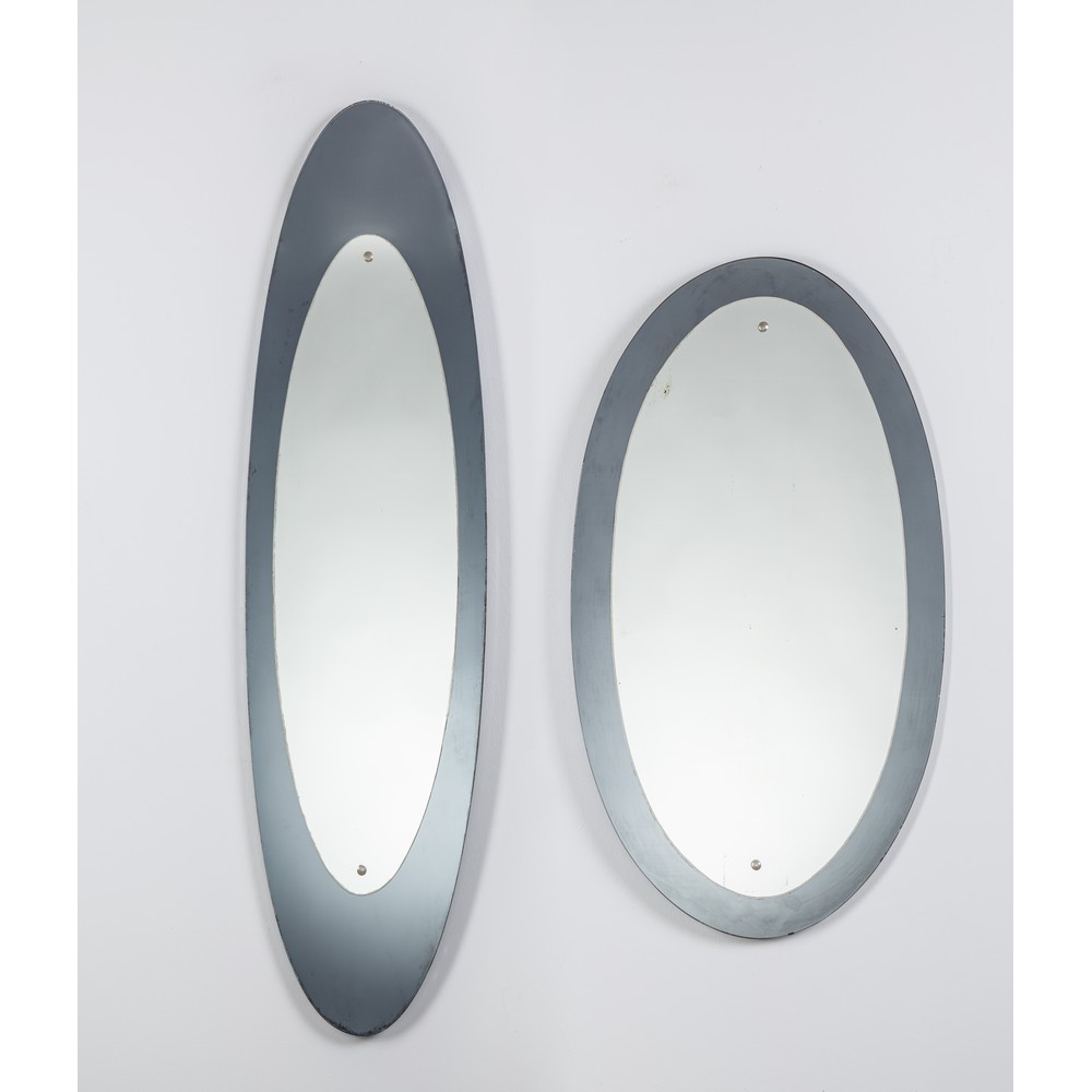 Due specchi da parete, corpo ovalizzato, cornice in vetro fumé, vetri specchiati.