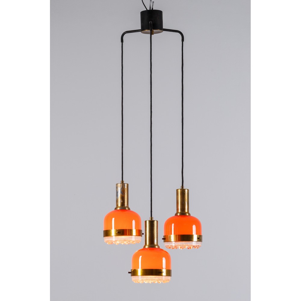 Lampada a sospensione a tre luci, composta da tre diffusori pendenti in vetro rosso con lenti applicate, finiture in ottone.