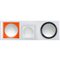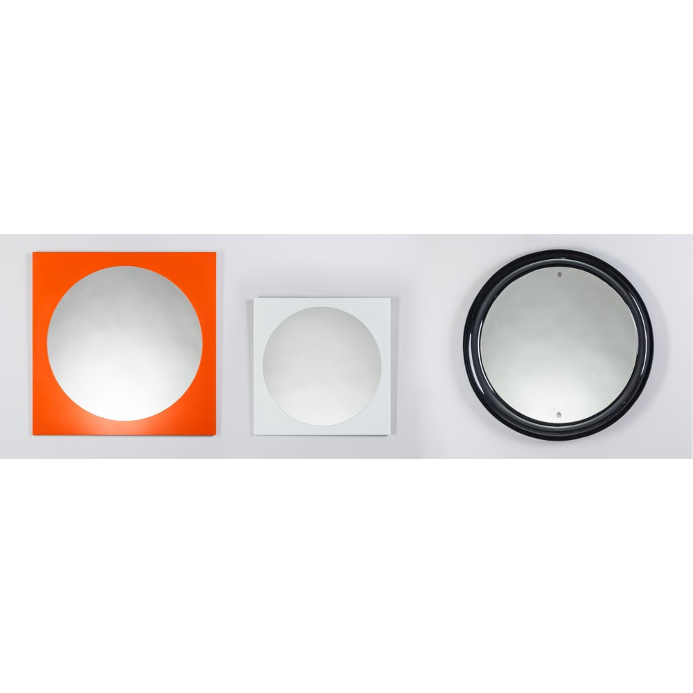 Tre specchi da parete, due circolari, di diverse misure con cornici quadrate in materiale plastico laccato arancione e bianco, il terzo circolare con spessa cornice concava a stampo in plastica nera.
