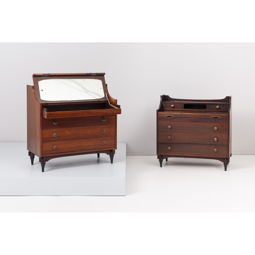 Due cassettoni, in legno di palissandro, uno con tre cassetti e un piano scorrevole a ribalta con toletta e specchio, l’altro con tre cassetti ed uno scrittoio sul piano superiore con due cassetti ed un vano a giorno. Mancanza di un vetro interno.