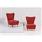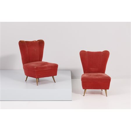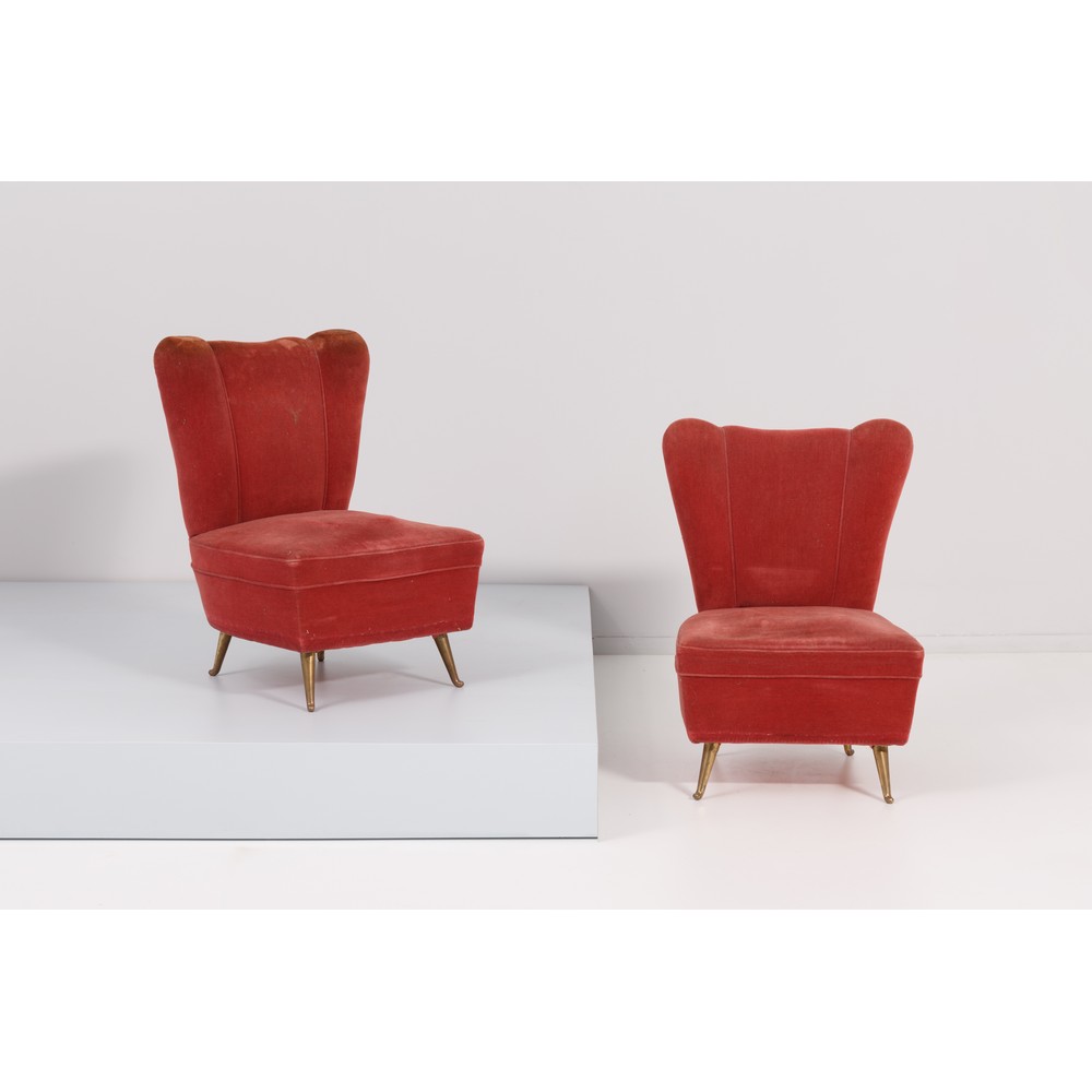 Coppia di poltrone, struttura in legno con imbottitura e rivestimento in velluto rosso, piedi a spillo in ottone.