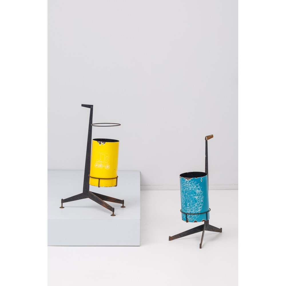 Due portaombrelli in metallo verniciato nero e da contenitore in metallo smaltato giallo e azzurro. Difetti.