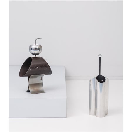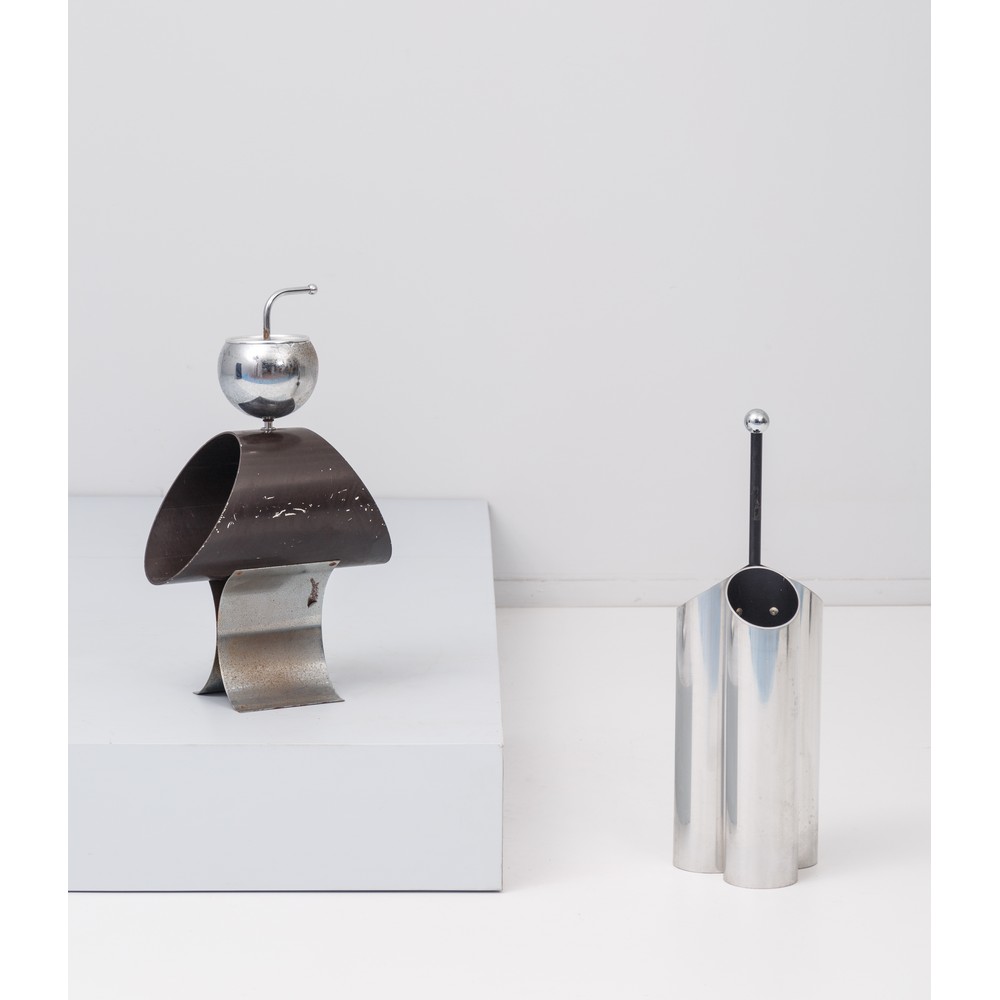 Posacenere/portariviste e portaombrelli in metallo cromato e curvato. Usure.