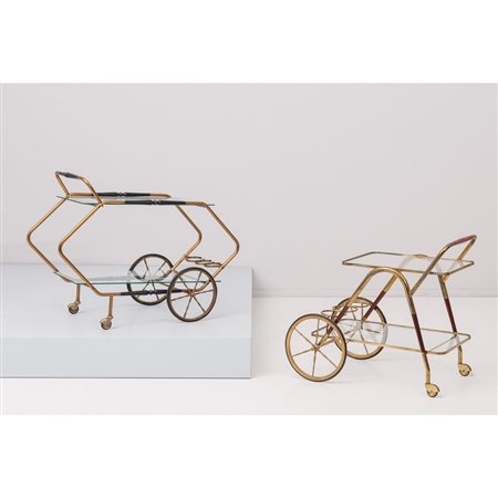 Due carrelli da servizio, uno dal profilo esagonale, l'altro con linee curve e grandi ruote, in legno e ottone con due ripiani in vetro trasparente.