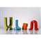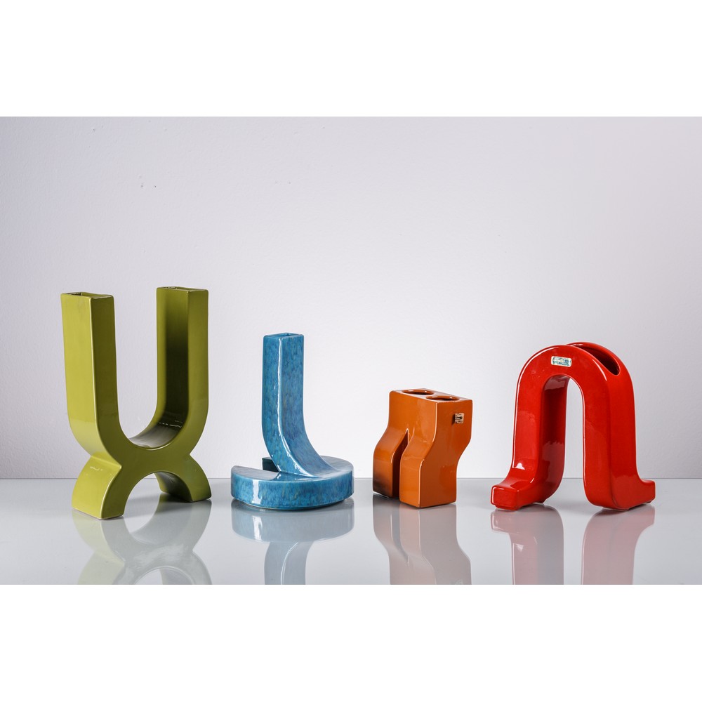 Quattro vasi in ceramica colorata, rosso, verde, azzurro, marrone, dai profili curvilinei. Il marrone riporta l'etichetta del design di Enzo Bioli per Il Picchio, quello rosso l'etichetta ‘Ceramiche d'arte Bertoncello, Schiavon (VI)’.