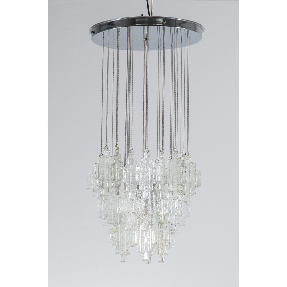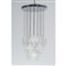 Lampada a sospensione a sette luci, corpo conico formato da elementi pendenti a formelle cruciformi in vetro stampato trasparente, catenelle in acciaio.