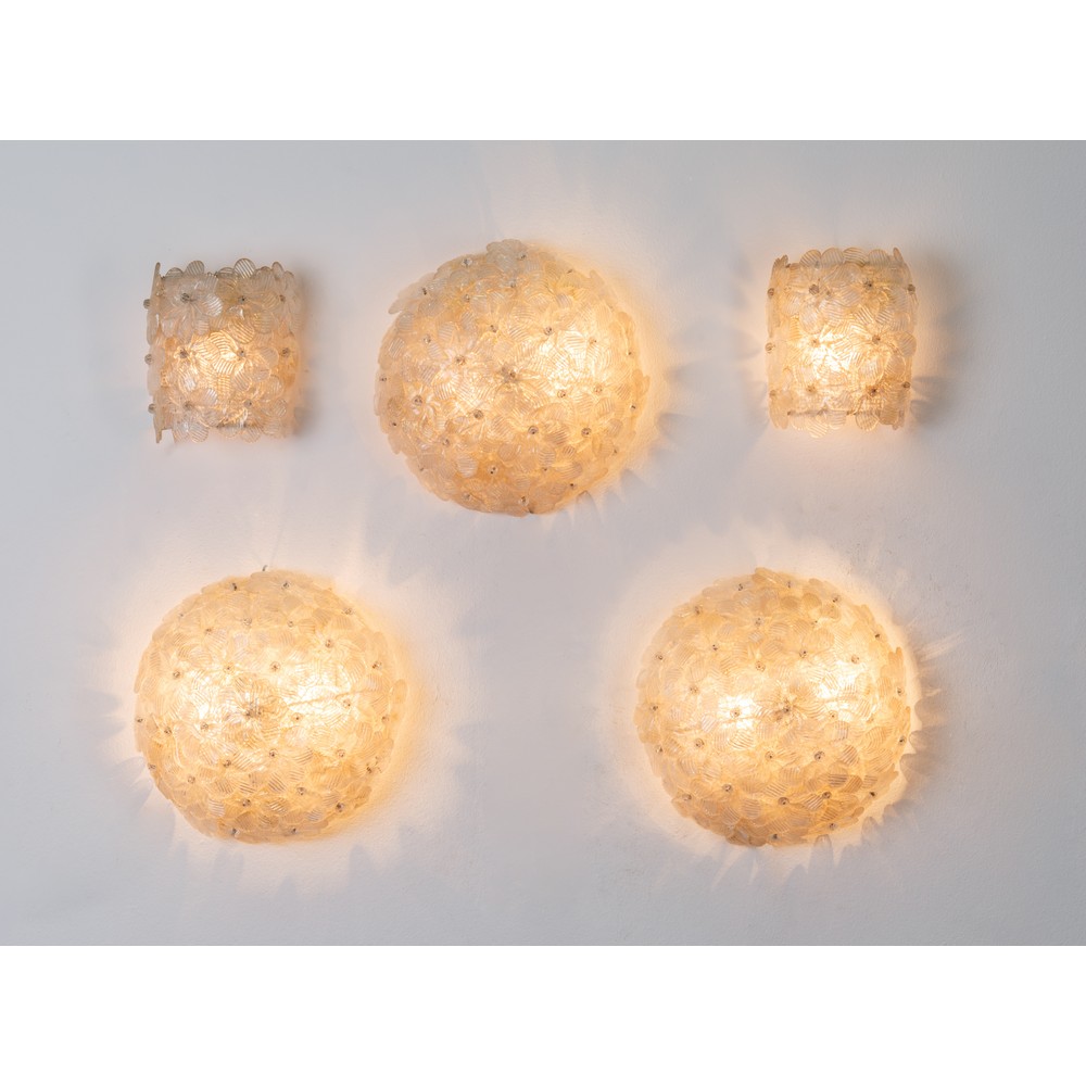 Tre lampade da soffitto e due lampade da parete, struttura in metallo decorata con fiori in vetro di murano trasparente e oro.