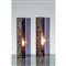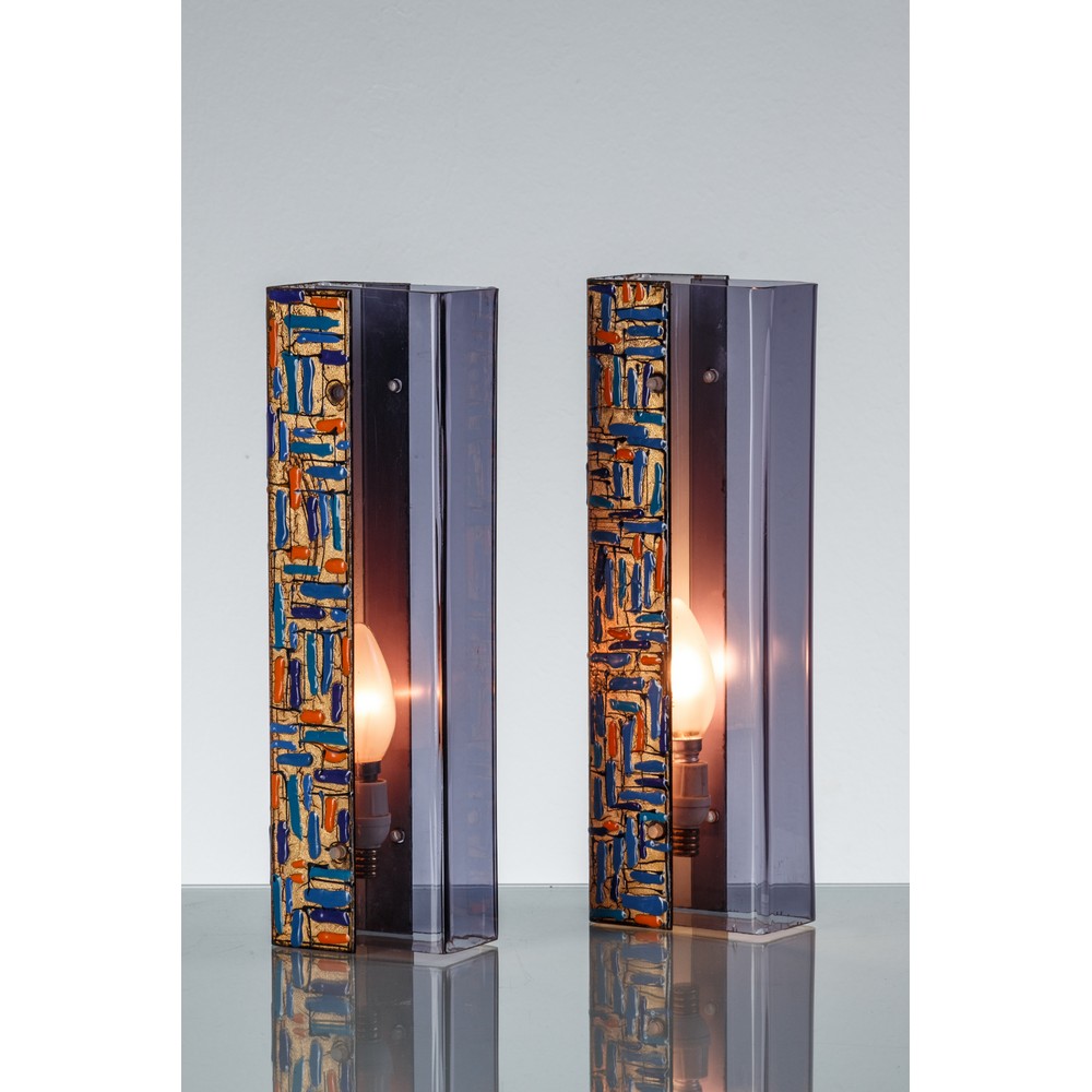 Coppia di lampade da tavolo ad una luce, corpo a parallelepipedo in metallo smaltato a decoro geometrico e perspex, mancanza di una vite.