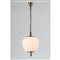 Lampada a sospensione in ottone, corpo ovalizzato in vetro satinato bianco.