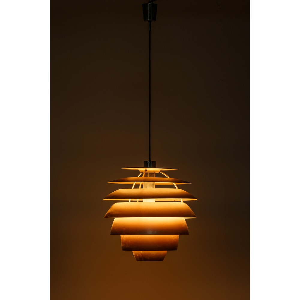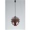 Lampada a sospensione mod. ‘1231’ ad una luce, diffusore luminoso ovalizzato composto da elementi concentrici a lame in rame e metallo laccato nei toni melanzana. Sono presenti alcuni segni sulla superficie in rame.
