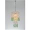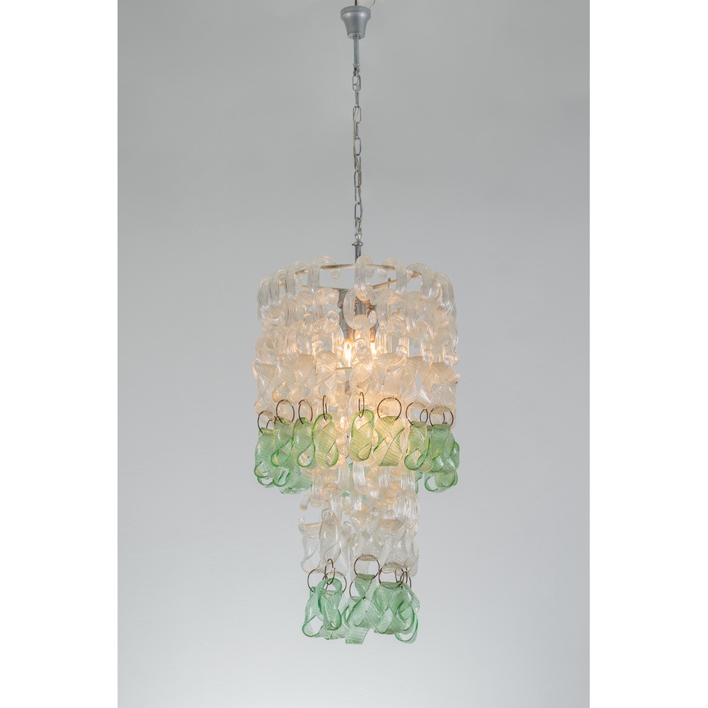 Lampada a sospensione, struttura in metallo, corpo cilindrico su due piani decorato con elementi modulari a maglia in vetro trasparente e verde.