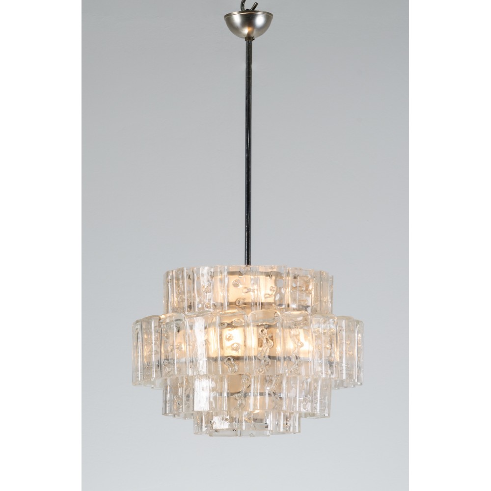 Lampada a sospensione corpo circolare su quattro livelli, struttura in metallo con elementi modulari in vetro trasparente.