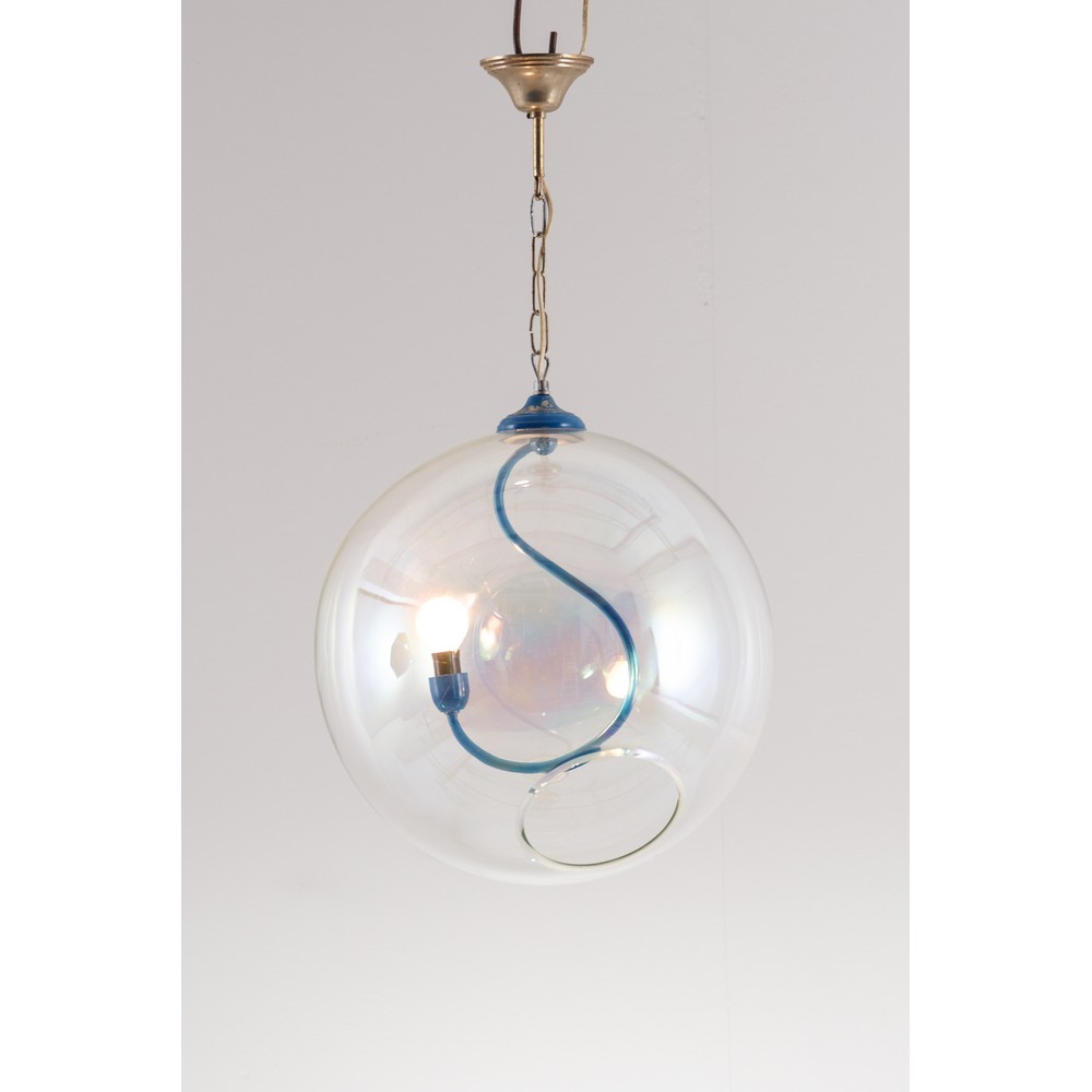 Lampada a sospensione ad una luce, corpo sferico trasparente con braccio snodabile interno blu.