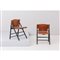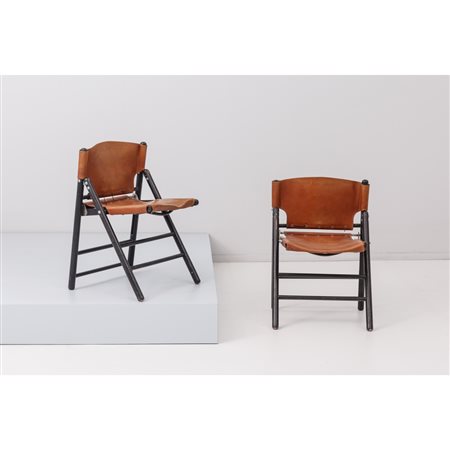 Coppia di sedie pieghevoli in legno verniciato nero, spalliera e seduta in cuoio naturale.