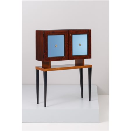 Mobile bar in legno di palissandro, composto da un corpo a due ante battenti con vetri specchiati e decorati con due stelle poggiante su consolle a quattro piedi in legno laccato nero e piano in legno di noce. Restaurato.