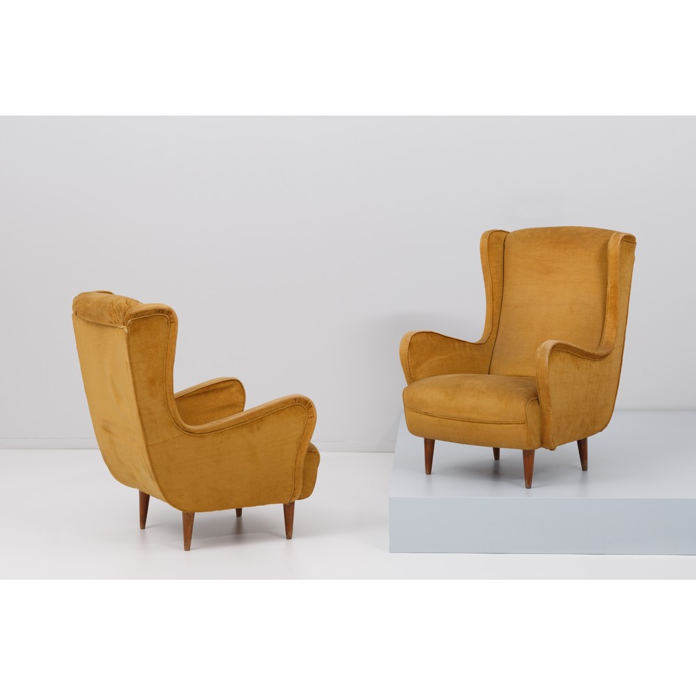 Coppia di poltrone Bergere, struttura in legno con imbottitura e rivestite in tessuto di velluto senape, piedi conici in legno.