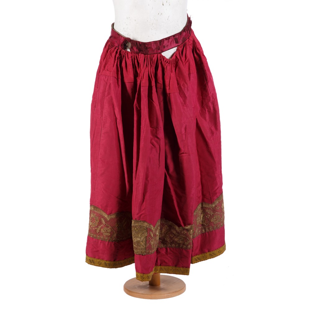 GONNA IN TESSUTO nei toni del rosso con frange in filo d’argento.