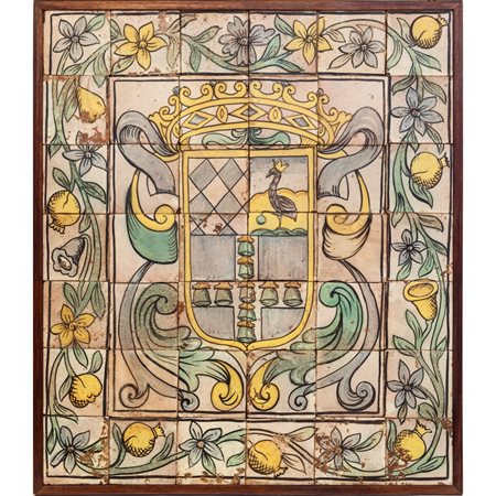 PANNELLO in ceramica smaltata e decorata raffigurante “Stemma nobiliare”, cornice a motivo floreale.