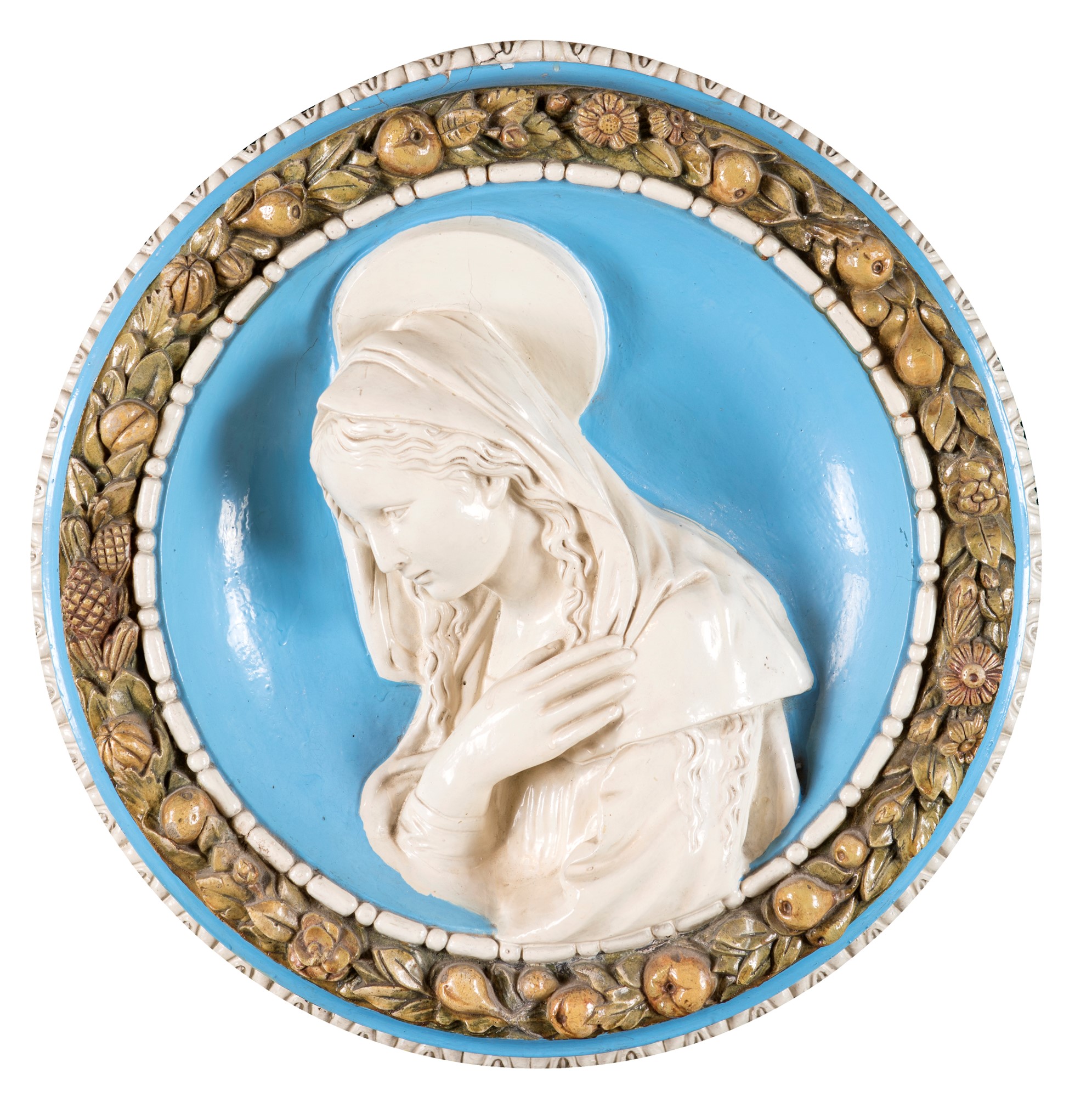 diametro cm 68 diametro cm 68 raffigurante la Vergine entro cornice caratterizzata da ghirlanda nel gusto delle ceramiche fiorentine rinascimentali robbiane