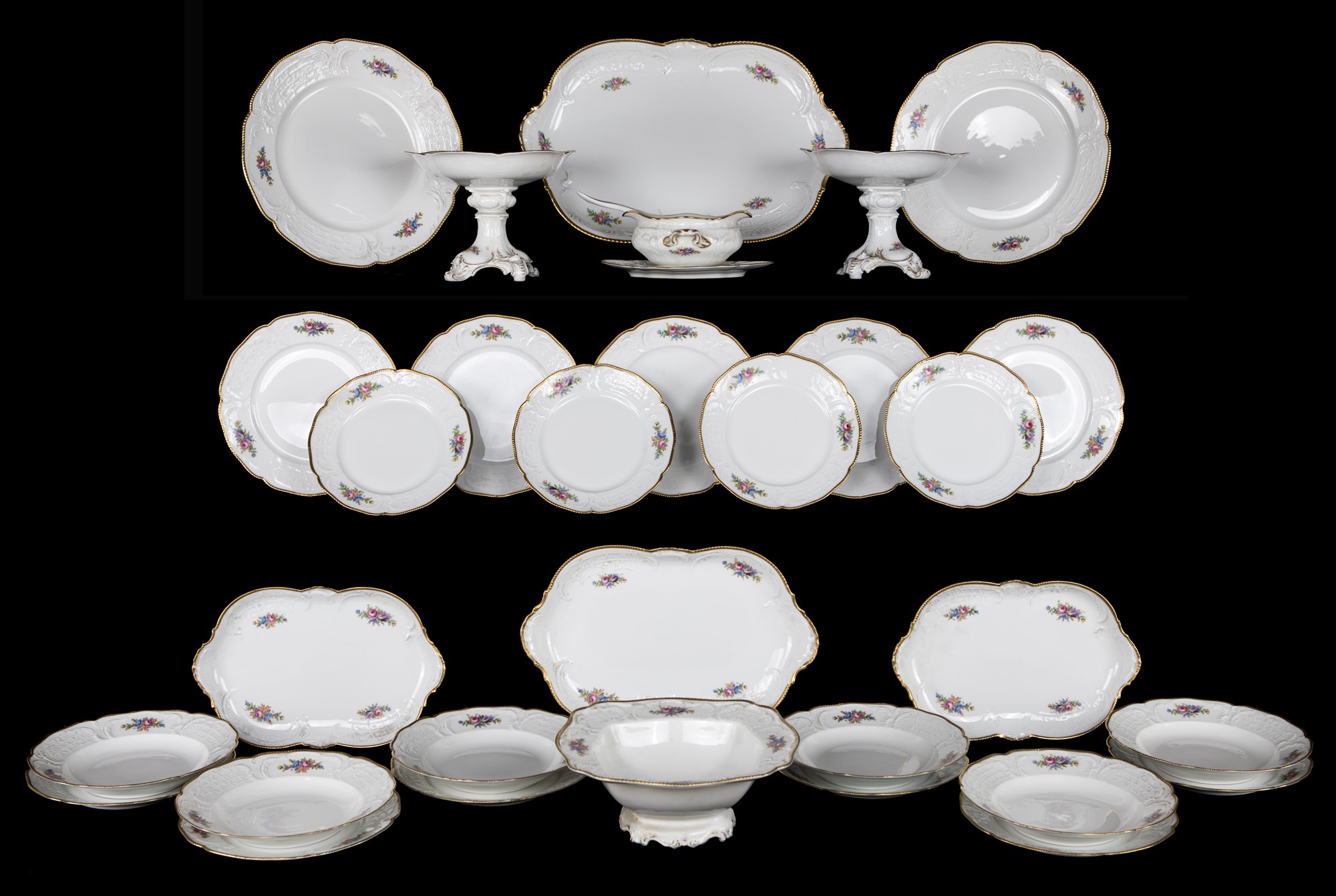 Servizio di piatti in porcellana, Rosenthal Sanssouci, Anni Cinquanta composto da 35 piatti piani, 9 fondi, 12 da frutta, 2 piatti da portata rotondi e 4 ovali di diversa misura, 2 alzatine, una fruttiera, una salsiera ed una raviera