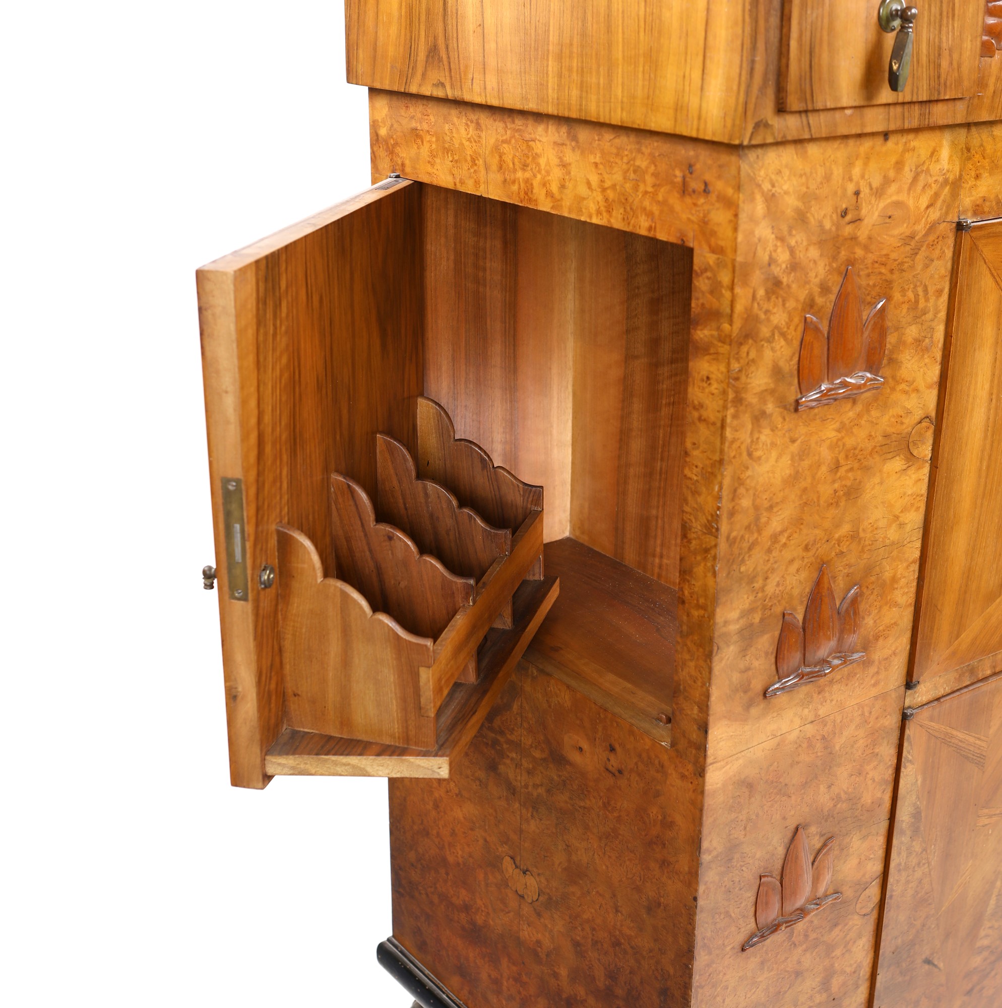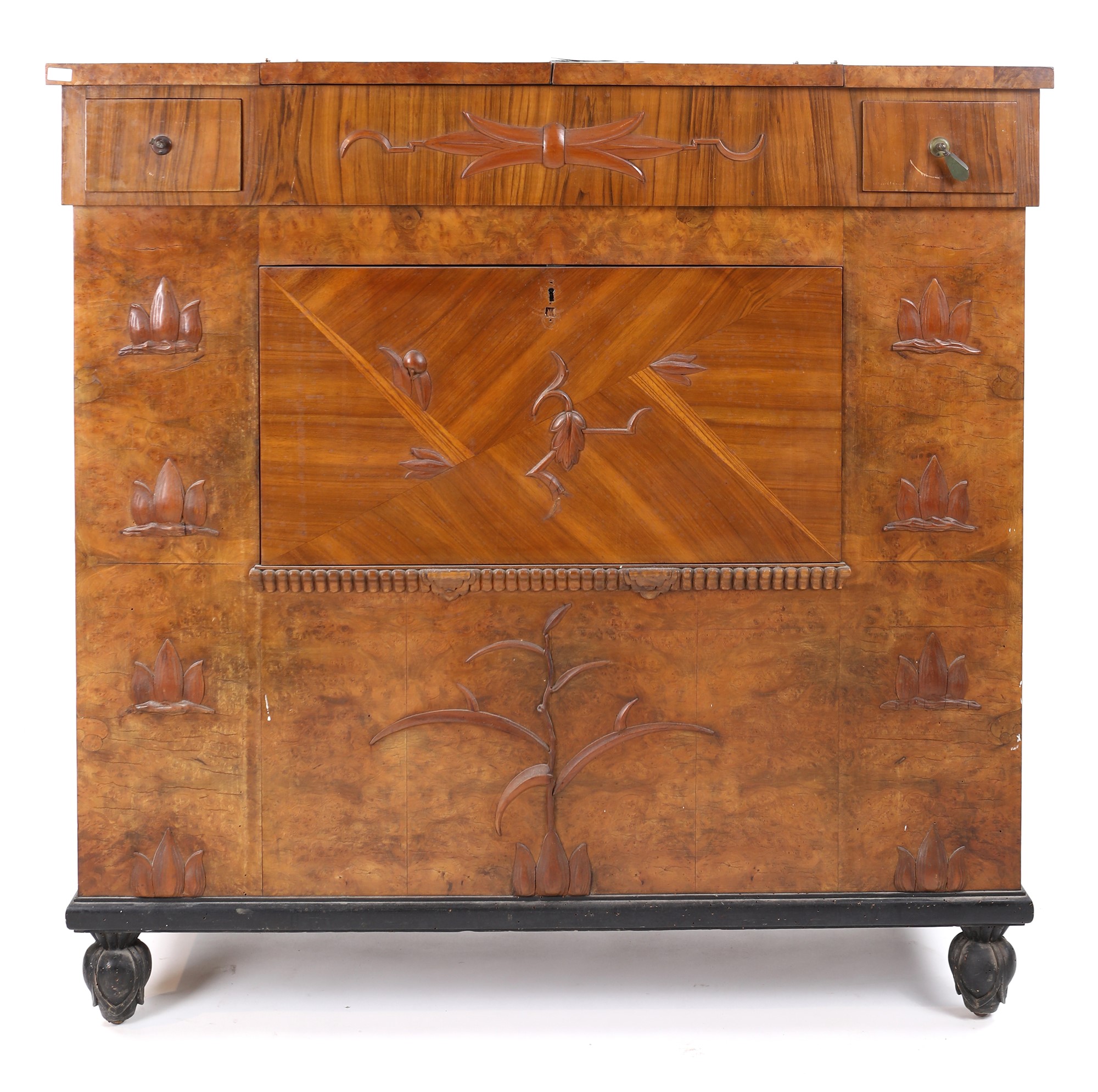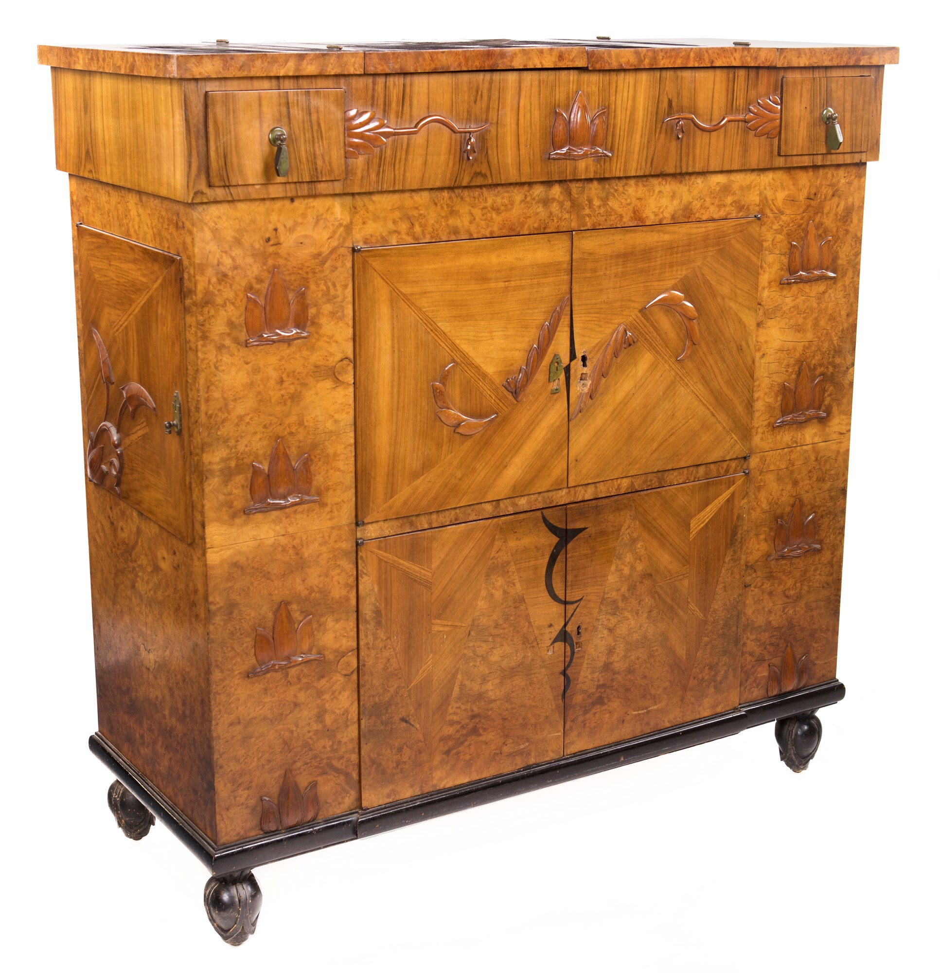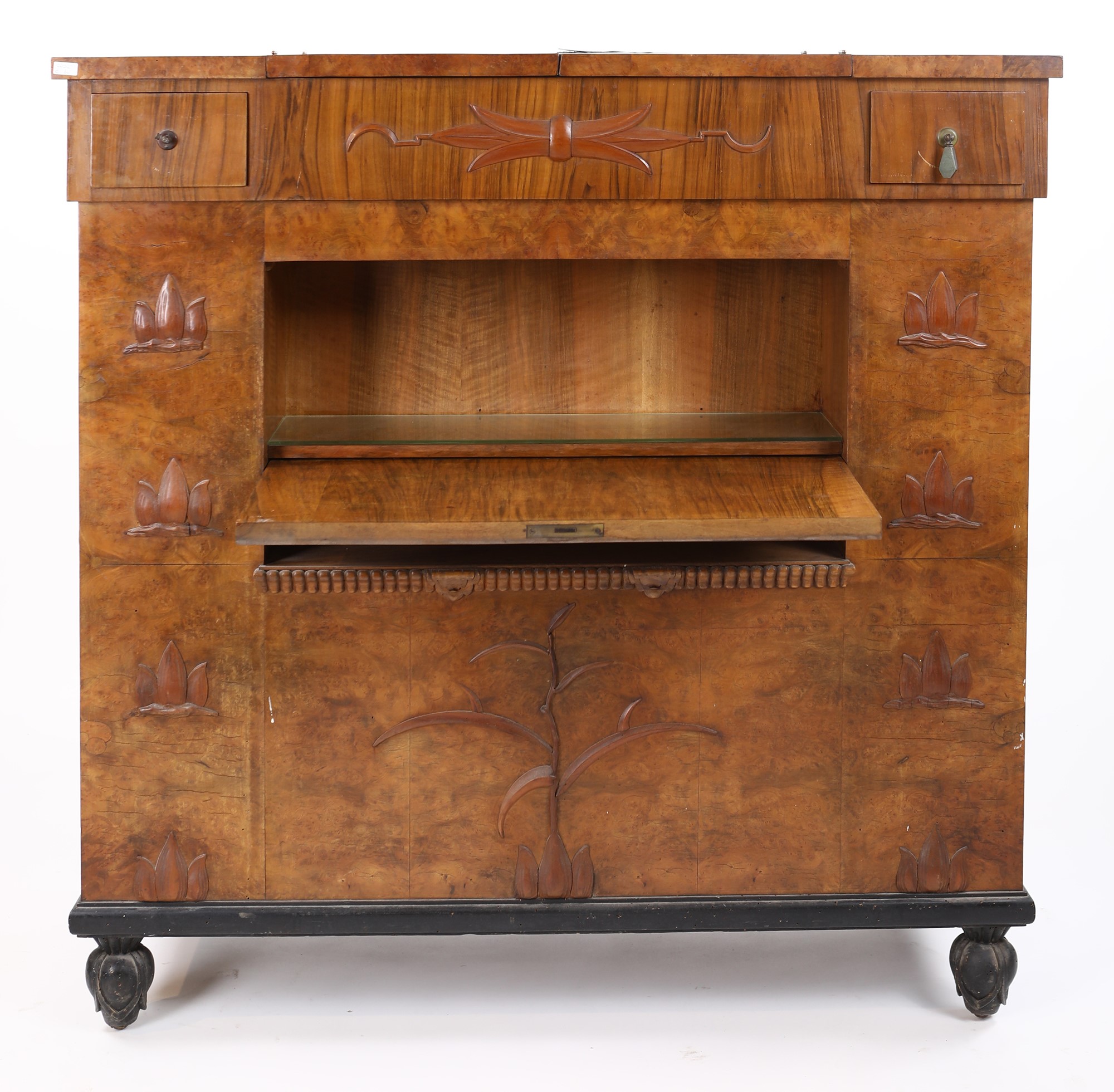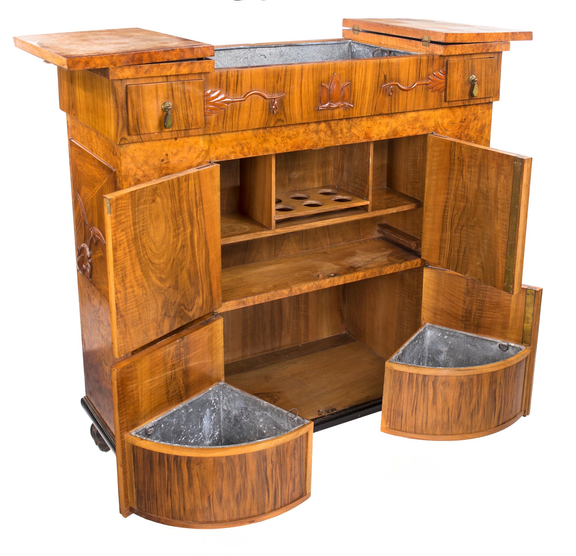 cm 123x120x51 cm 123x120x51 caratterizzato da rilievi ornamentali naturalistici; di forma squadrata, reca piano superiore apribile a celare un ampio vano con vasca in metallo ed ante con divisori interni su entrambe le facciate; piedi a bulbo