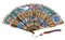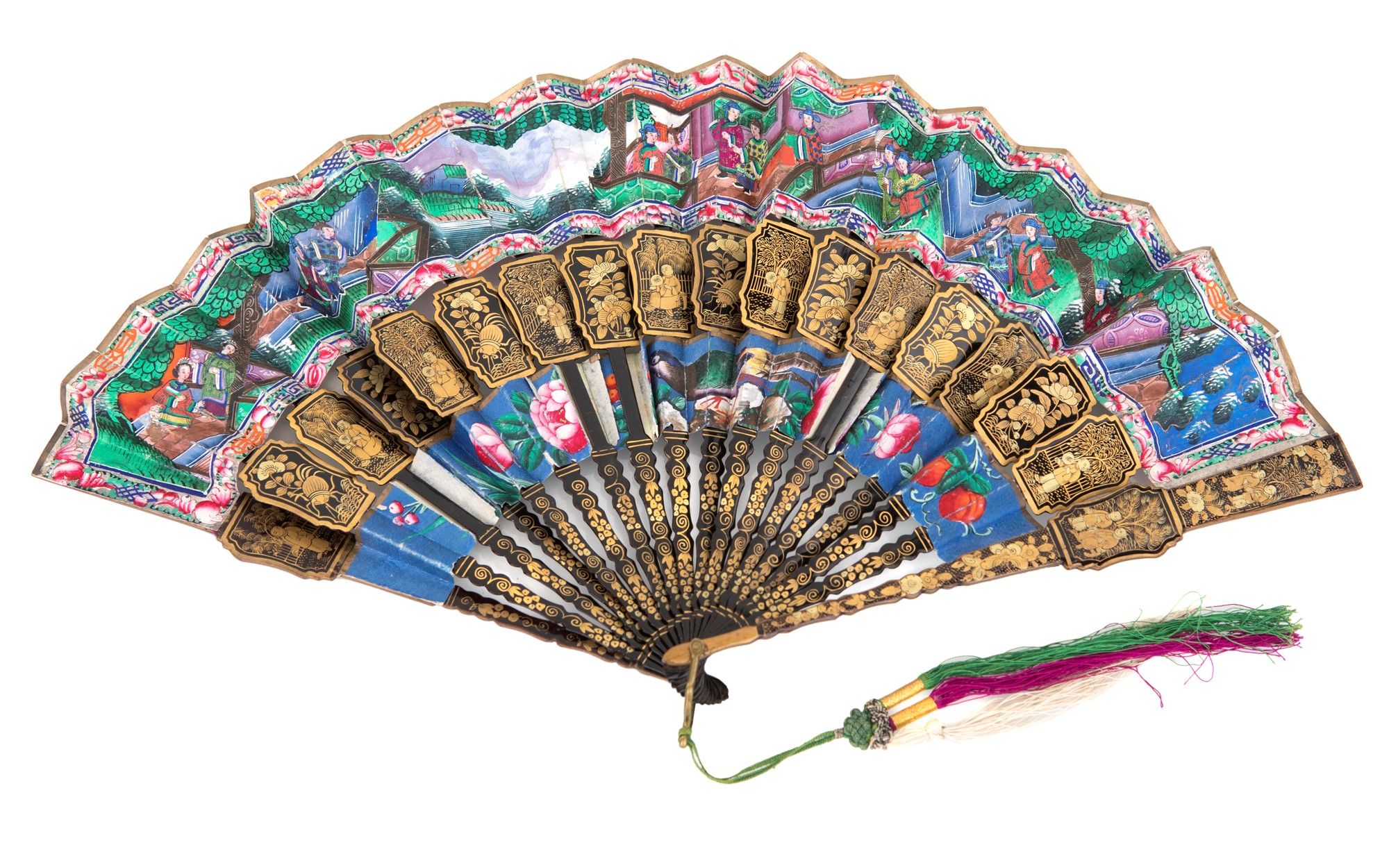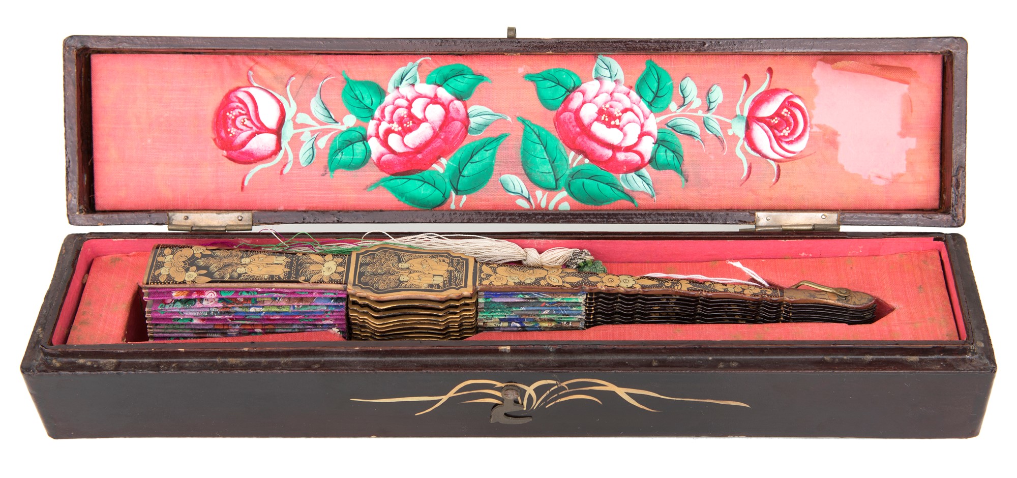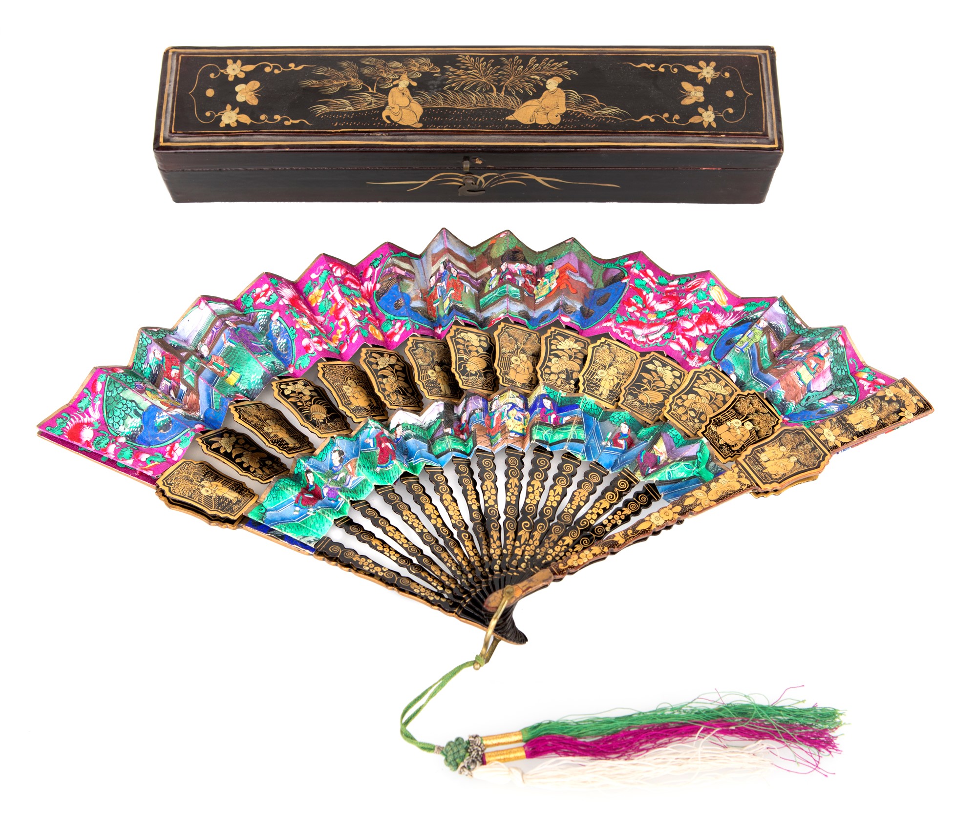 cm 4,5x27,5x5,5 - ventaglio: cm 21,5x39 cm 4,5x27,5x5,5 - ventaglio: cm 21,5x39 con stecche abbellite da miniature con figure di orientali e motivi naturalistici e due ordini di pagine in carta acquerellata decorata su ambedue i lati in vivace policromia a riserve con scene di genere animate da personaggi con volti minuziosamente resi su sottili scaglie di avorio. La scatola è similmente decorata in oro con figure e all'interno rivestita in seta arricchita da peonie dipinte. Lievi difetti all'interno della scatola