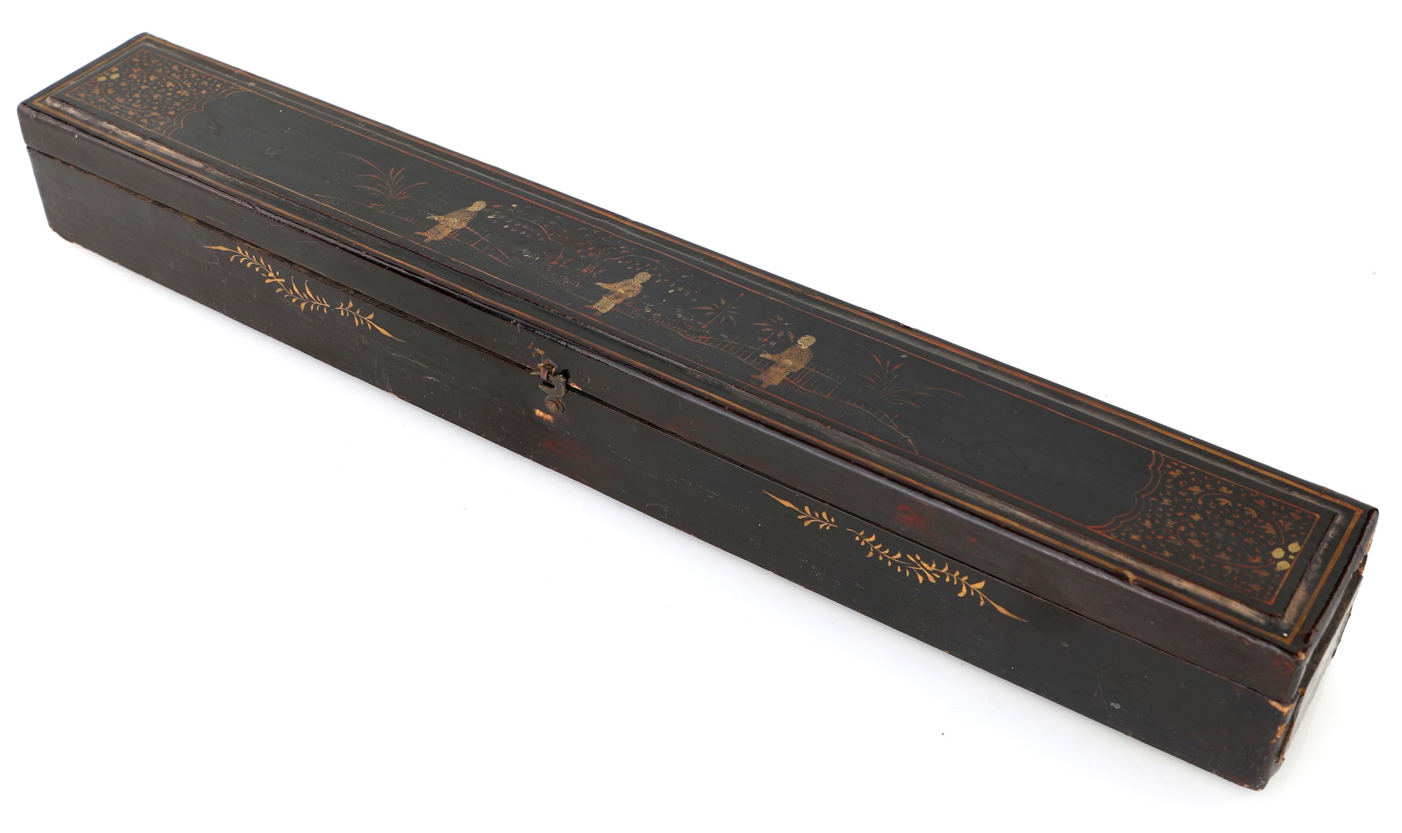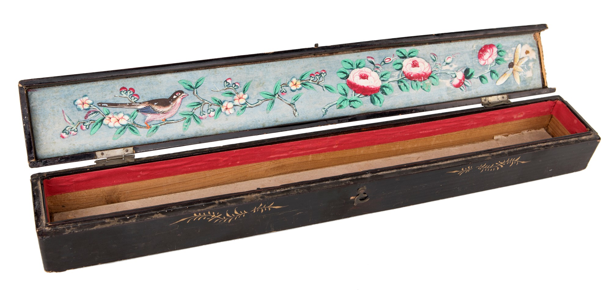 cm 5x43,5x6 cm 5x43,5x6 decorata sul coperchio da tre figure orientali su paesaggio minimo dipinto in oro; coperchio incernierato rivestito al verso in seta dipinta decorata da un rami di ciliegio con volatile ed un tralcio di peonia con libellula. Lievi difetti e piccola mancanza