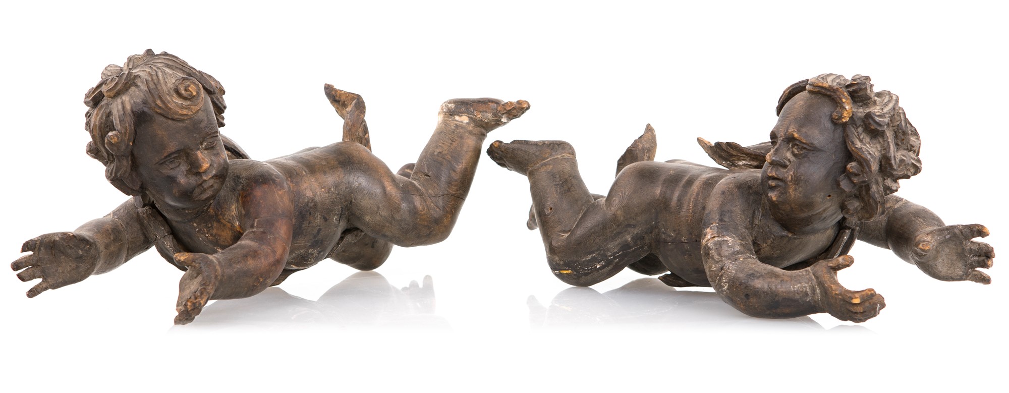 cm 15x40x15 ca ognuna cm 15x40x15 ca ognuna raffiguranti amorini ritratti in posizione prona con panneggi svolazzanti. Piccole mancanze