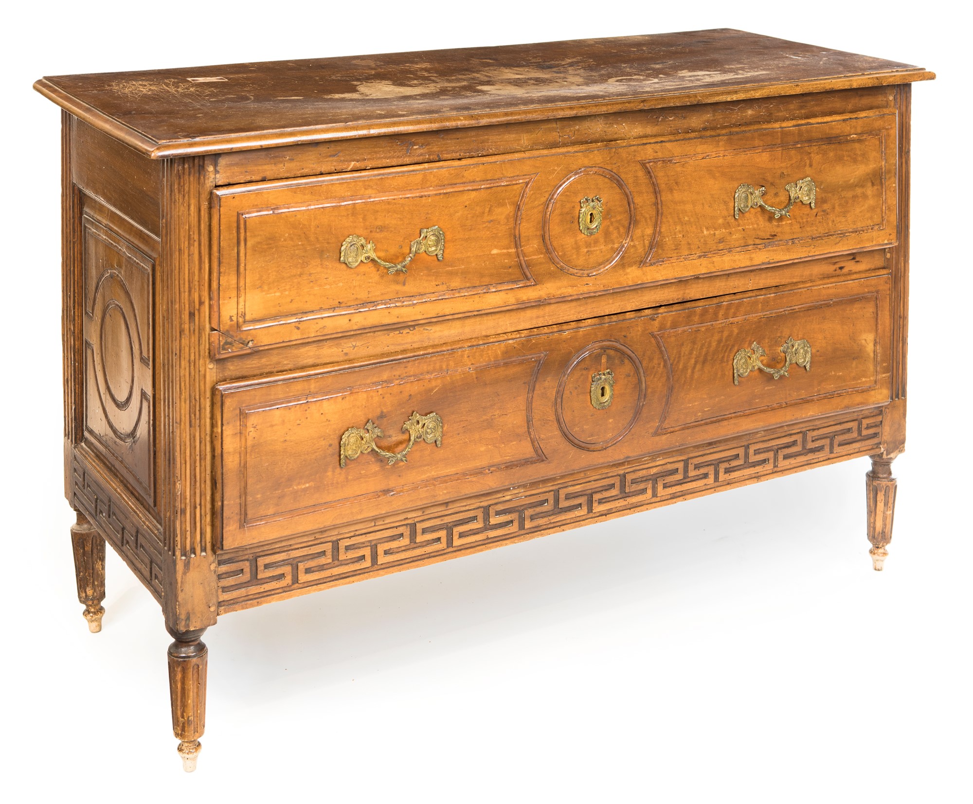 cm 83x132x52 cm 83x132x52 con due cassetti delimitati da lesene angolari; fascia inferiore percorsa da greca intagliata, piedi rastremati scanalati. Difetti e restauri