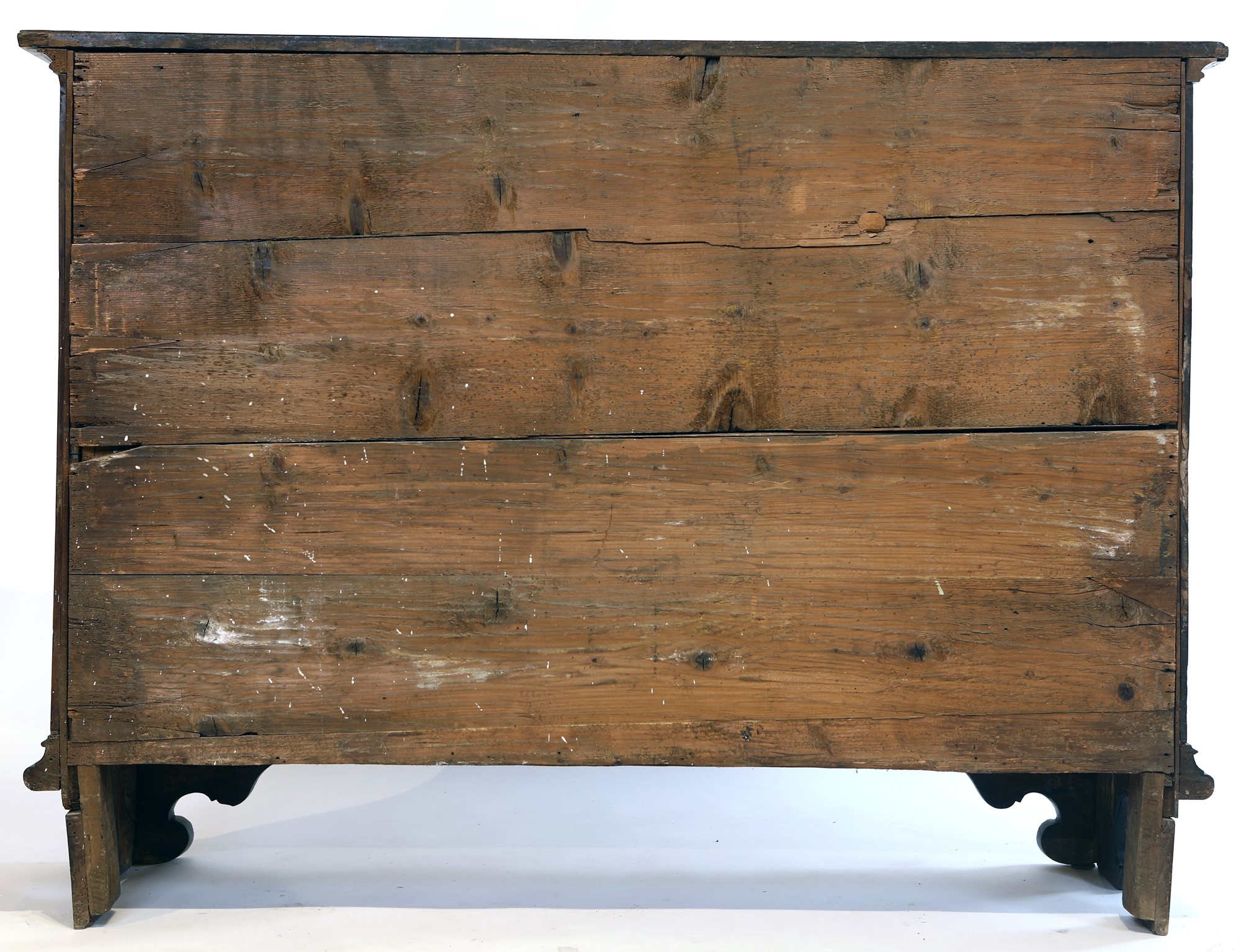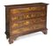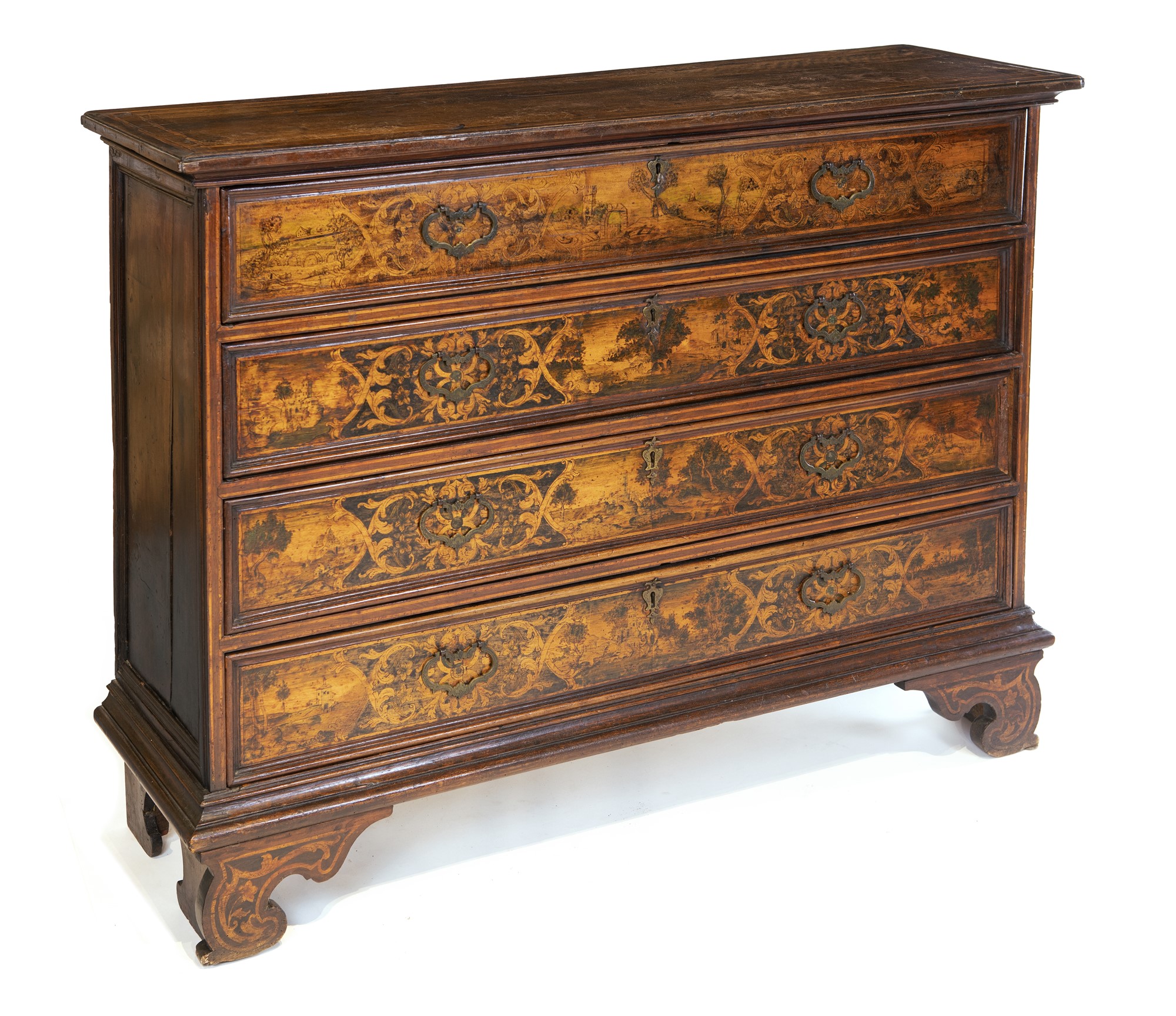 cm 107x144x45 cm 107x144x45 con quattro cassetti frontali con maniglie in bronzo, caratterizzati da vedute pirografate racchiuse entro riserve sagomate circondate da fitta decorazione a motivi vegetali e fiori. Due ordini di filettature lineari incorniciano il piano, piedi a mensola. Difetti e restauri