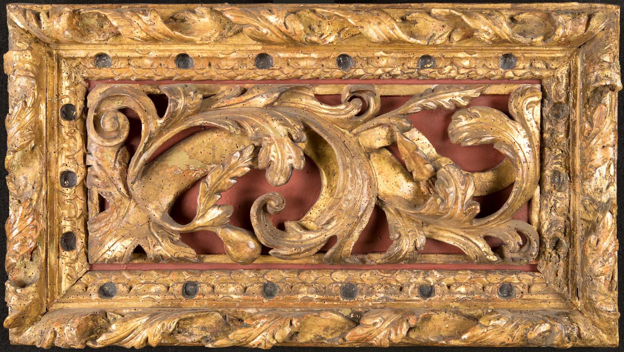 cm 42x75 cm 42x75 in forma di volute vegetali variamente ricurve, applicate su pannello entro cornice intagliata.