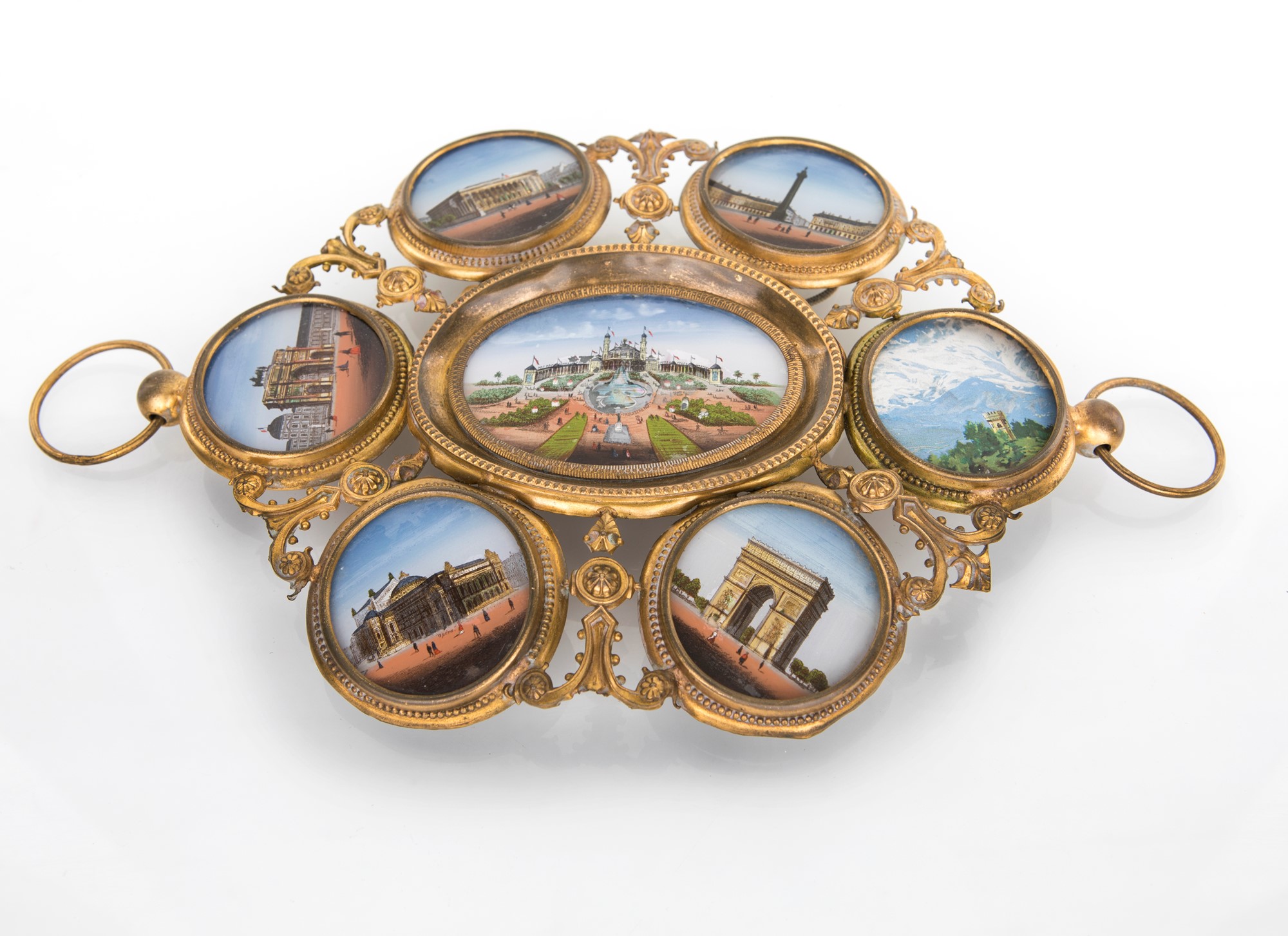 cm 17x29 - miniature diametro cm 5 e cm 5x7,5 cm 17x29 - miniature diametro cm 5 e cm 5x7,5 caratterizzato da sette miniature su vetro con inserti in madreperla, di cui sei raffiguranti vedute di Parigi; al centro i giardini del Trocadero e tutt'intorno si dispongono l'Arco di Trionfo del Carrousel col Palazzo del Louvre, Palazzo Brogniart in stile corinzio, Piazza Vendôme, l'Opéra Garnier e l'Arco di Trionfo; una settima miniatura non pertinente con scorcio montano. Struttura danneggiata